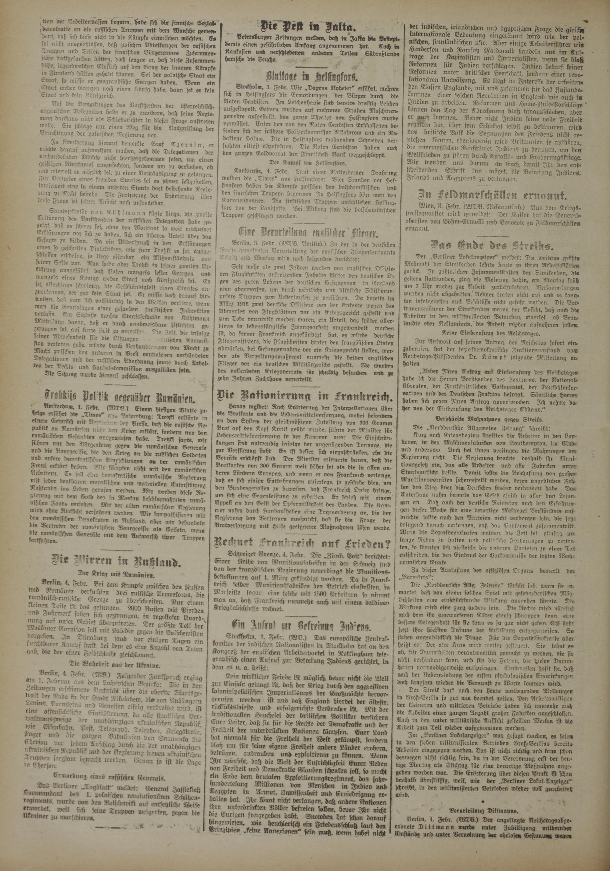 der Arbeitermassen begann, ^abe sich die finnische Sozial» .deinelratie an die russischen Truppen mit dem Wunsche gerne*, 'tont, daß sich diese nicht in die Kämpfe einmischen möchten. Es fei nicht ausgeschlossen, daß Zwischen Abteilungen der russischen Truppen und Teilen der finnischen Bürgerarmee Zusammenstöße stcrttgefunden hätten, doch leugne er, daß diese Zusammen. ftöi>e, irgendwelchen Einfluß auf den Gang der inneren Kämpfe in Finnland hätten gehabt können. Sei der polnische Staat ein Staat, so müsse er geographische Grenzen haben. Wenn ein ^Laat weder Grenzen noch einen König habe, dann sei er kein Staat und kein Königreich.