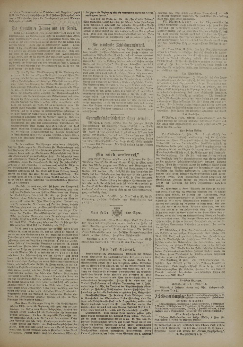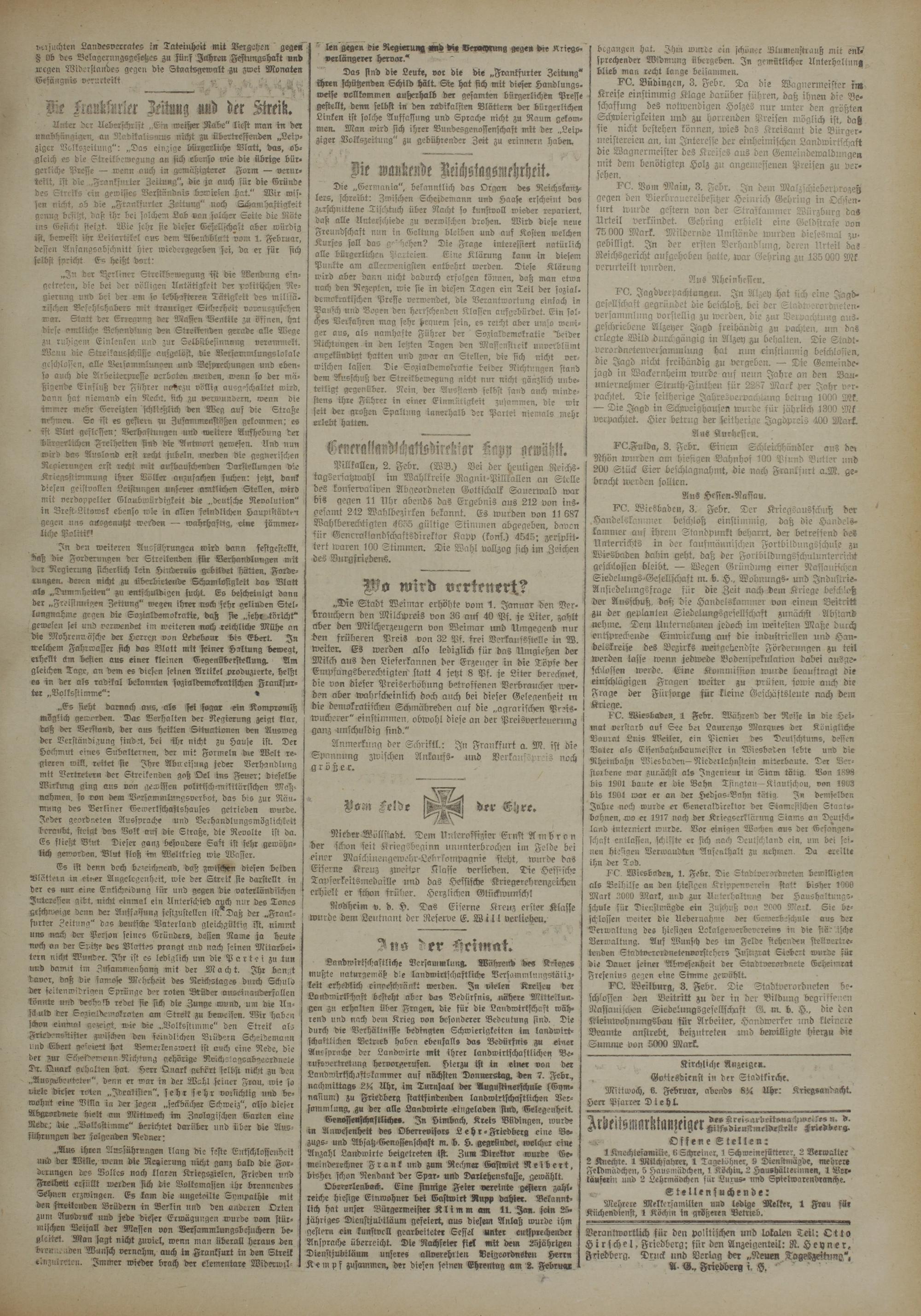 „Aus ihren Ausführungen klang die feste Entschlossenheit imb der Wille, wenn die Regierung rücht ganz bald die Forderungen L-es Voltes nach klaren Kriegszielen. Frieden und Freiheit erfüllt werden sich die Volksmafsen ihr brennendes Sehnen erzwingen. Es kam die ungeteilte Sympathie mit den streikenden Brüdern in Berlin und den anderen Orten zum Ausdruck und jede dieser Erwägungen wurde vom stürmischen Beifall der Mafien von Dersammlungsbesiichern begleitet. Man sagt nicht zuviel, wenn man überall heraus den *ren,i. Mben Wunsch vernahm, auch in Frankfurt in den Streik einzttlroten. Immer wieder brach der elementare Widerwil