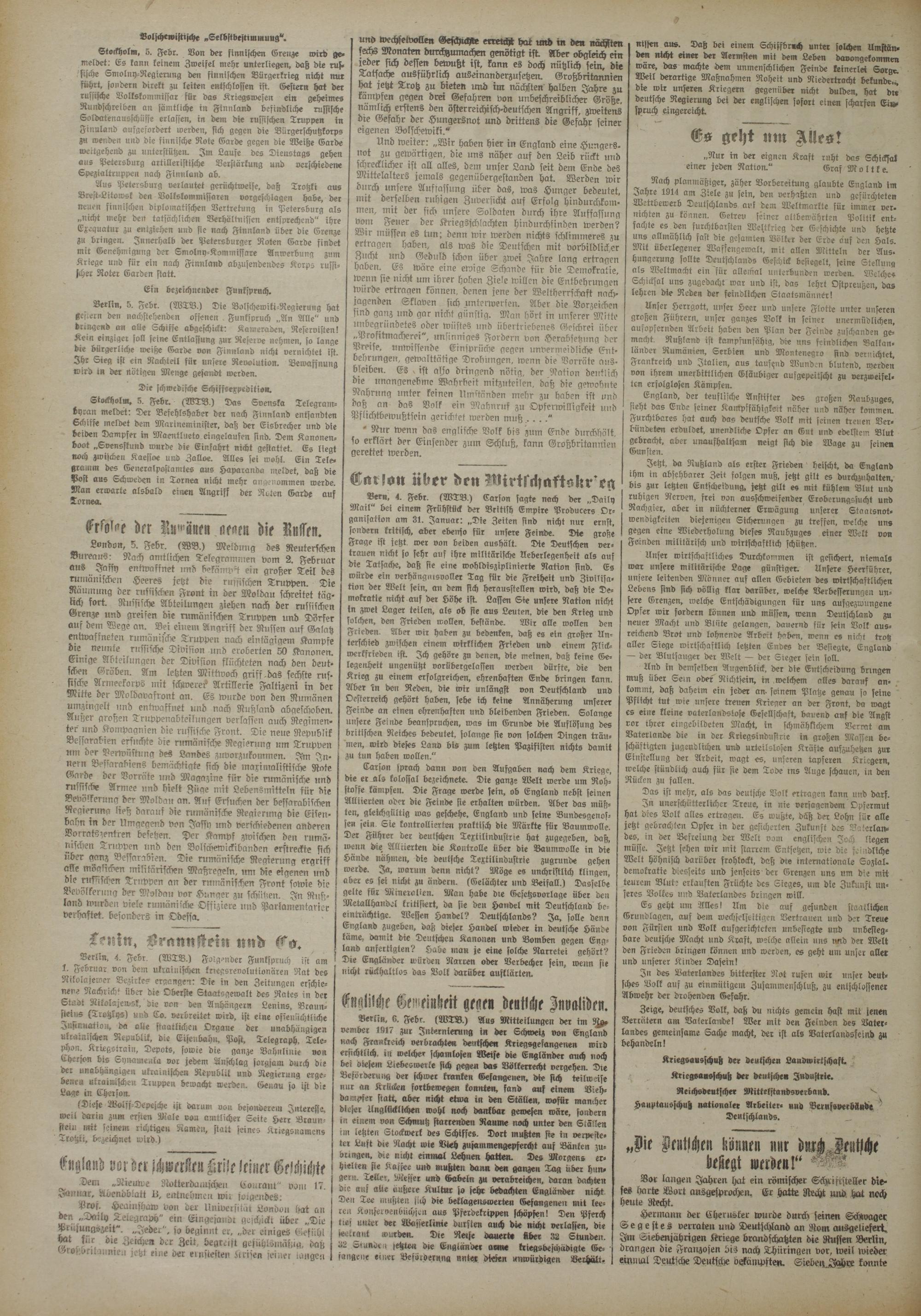 England, der teuflische Ansttfter des großen Raubzuges, sieht das Ende seiner Kampffähigksit näher und näher kommen. Furchtbares hat auch das deutsche Volk mtt seinen tteuen Verbündeten erduldet, unendliche Opfer an Gut und edelstem Blut gebracht, aber unaufhaltsam neigt sich die Wage zu seinen Gunsten.