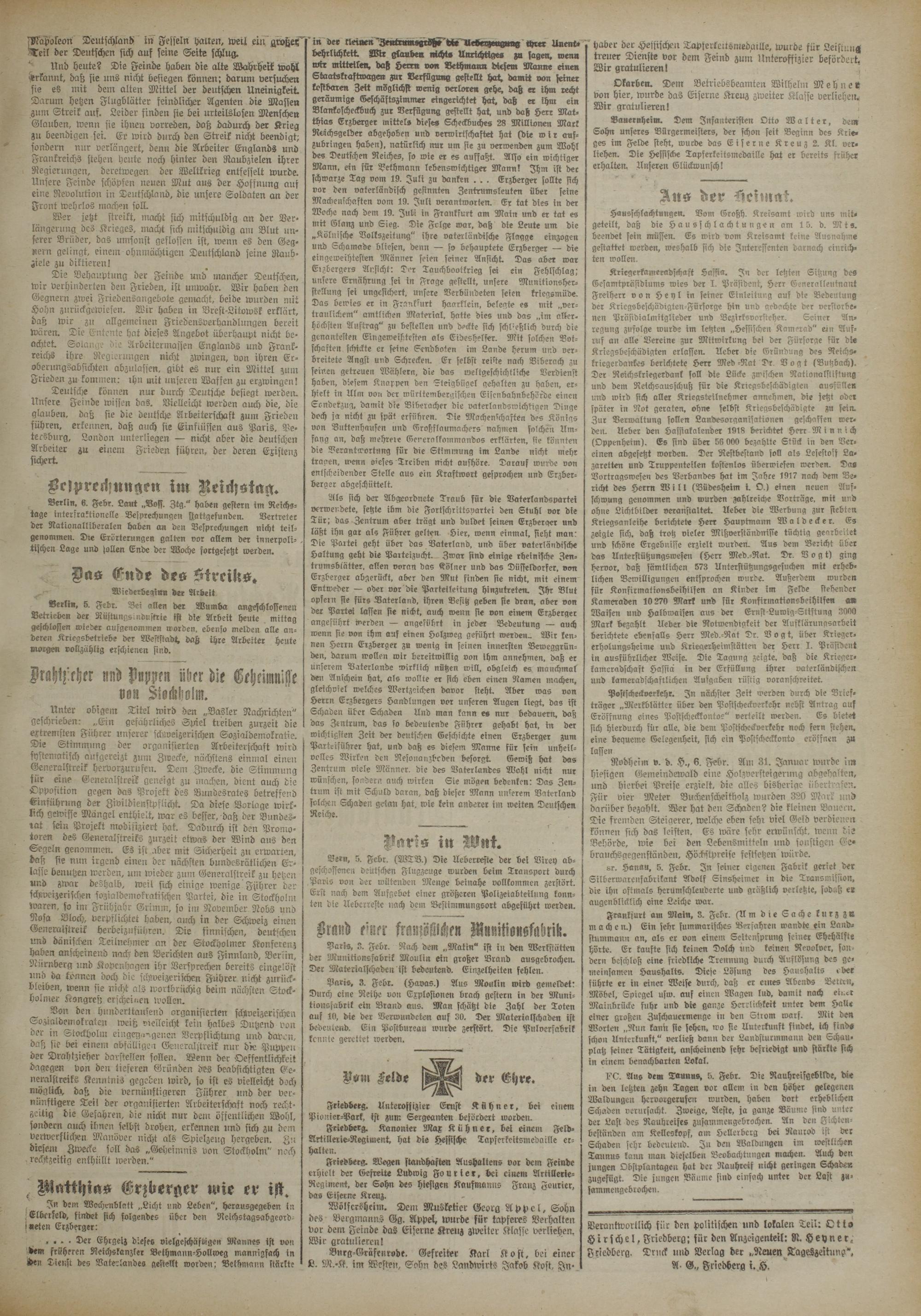 Und heute? Die Feinde haben die alte Wahrheit wohl 'irrkannt, daß sie uns nicht besiegen können; darum versuchen sie es mit dem alten Mittel der deutschen Uneinigkeit. Darum Hetzen Flugblätter feindlicher Agenten die Massen zum Streik auf. Leider finden sie bei urteilslosen Menschen Glauben, wenn sie ihnen Vorreden, daß dadurch der Krieg zu beendigen sei. Er wird durch den Streik nicht beendigt; sondern nur verlängert, denn die Arbeiter Englands und Frankreichs stehen heute noch hinter den Raubzielen ihrer Regierungen, deretwegen der Weltkrieg entfesselt wurde. Unsere Feinde schöpfen neuen Mut aus der Hoffnung auf eine Revolution in Deutschland, die unsere Soldaten an der Front wehrlos machen soll.