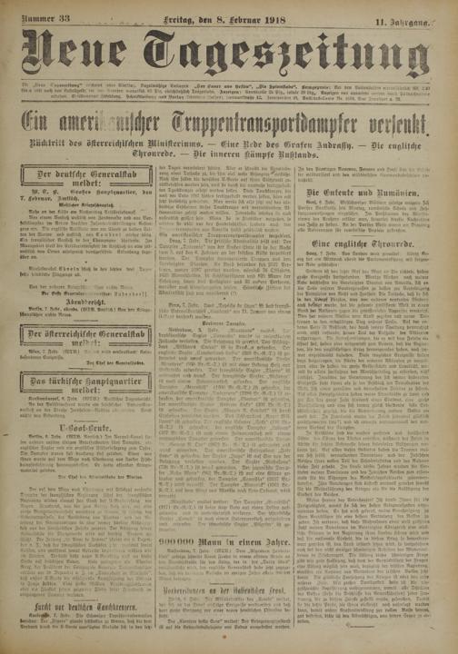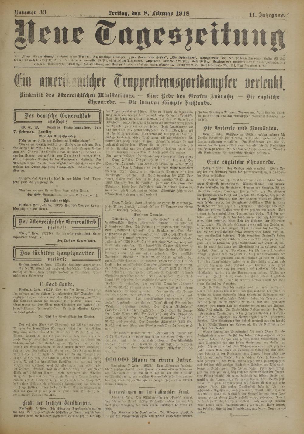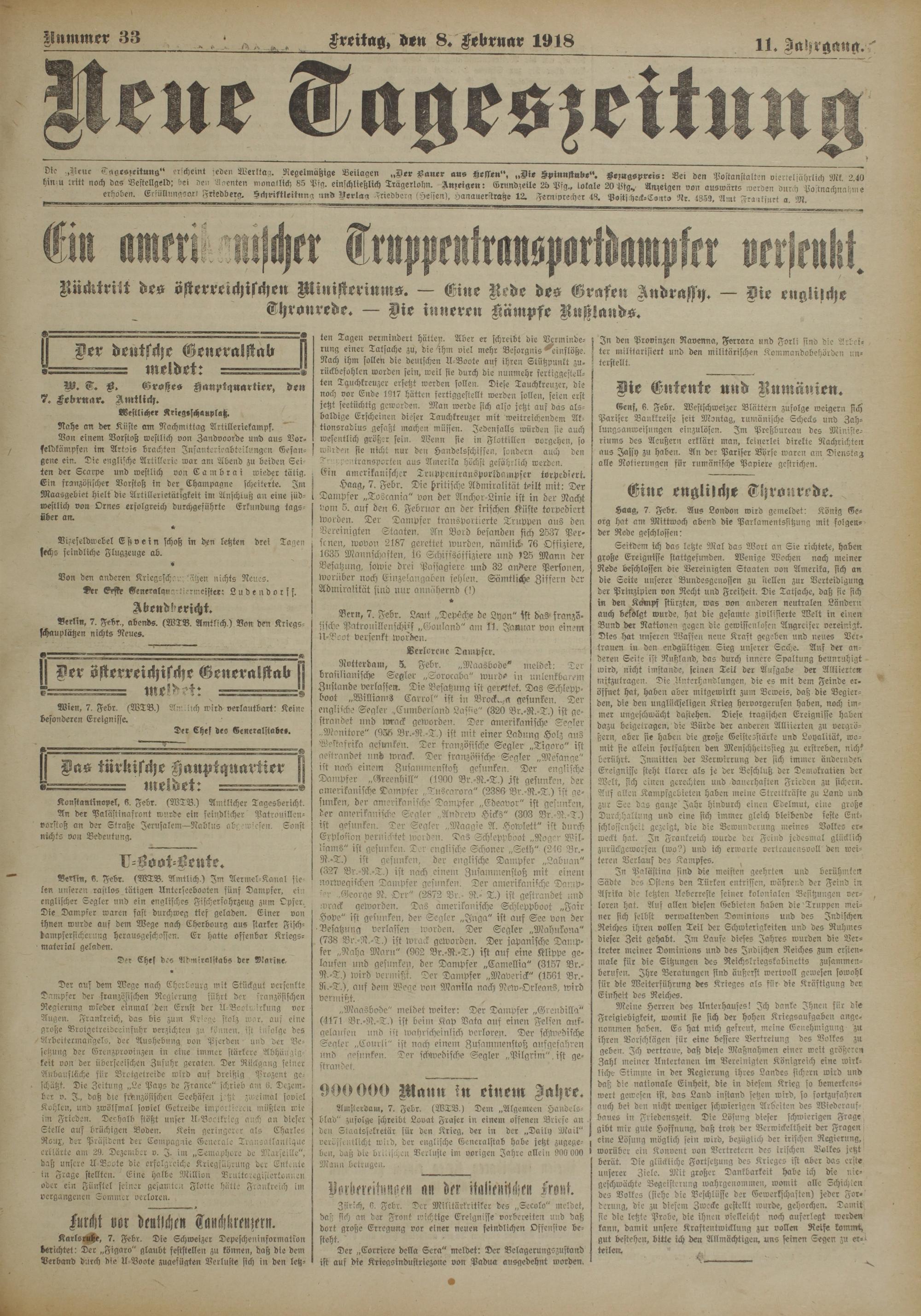Haag, 7. Febr. Die Kritische Admiralität teilt mit: Der Danipfer „Toscama" von der Anchor-Linie ist in der Nacht vom 6. auf den 6. Februar an der irischen Küste torpediert worden. Der Dampfer transportierte Truppen aus den | Vereinigten Staaten. An Bord befanden sich 2637 Per- scnen, wovon 2187 gerettet wurden, nämlich' 76 Offiziere, 1635 Mannschaften, 16 Schiffsoffiziere und 125 Mann der Besatzung, sowie drei Passagiere und 32 andere Personen, worüber noch Einzelangaben fehlen. Sämtliche Ziffern der Admiralität find nur annähernd (!)