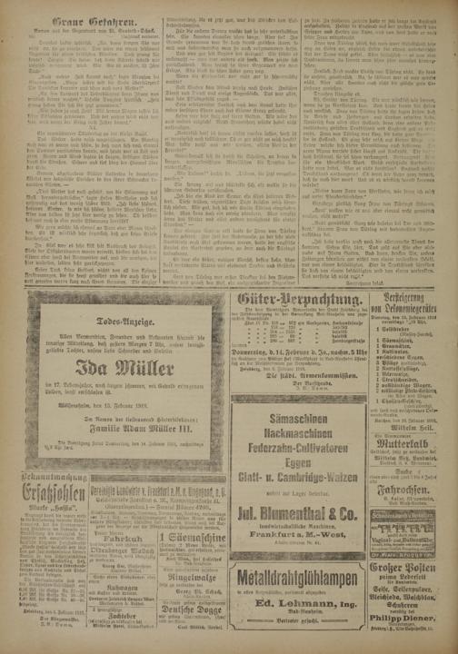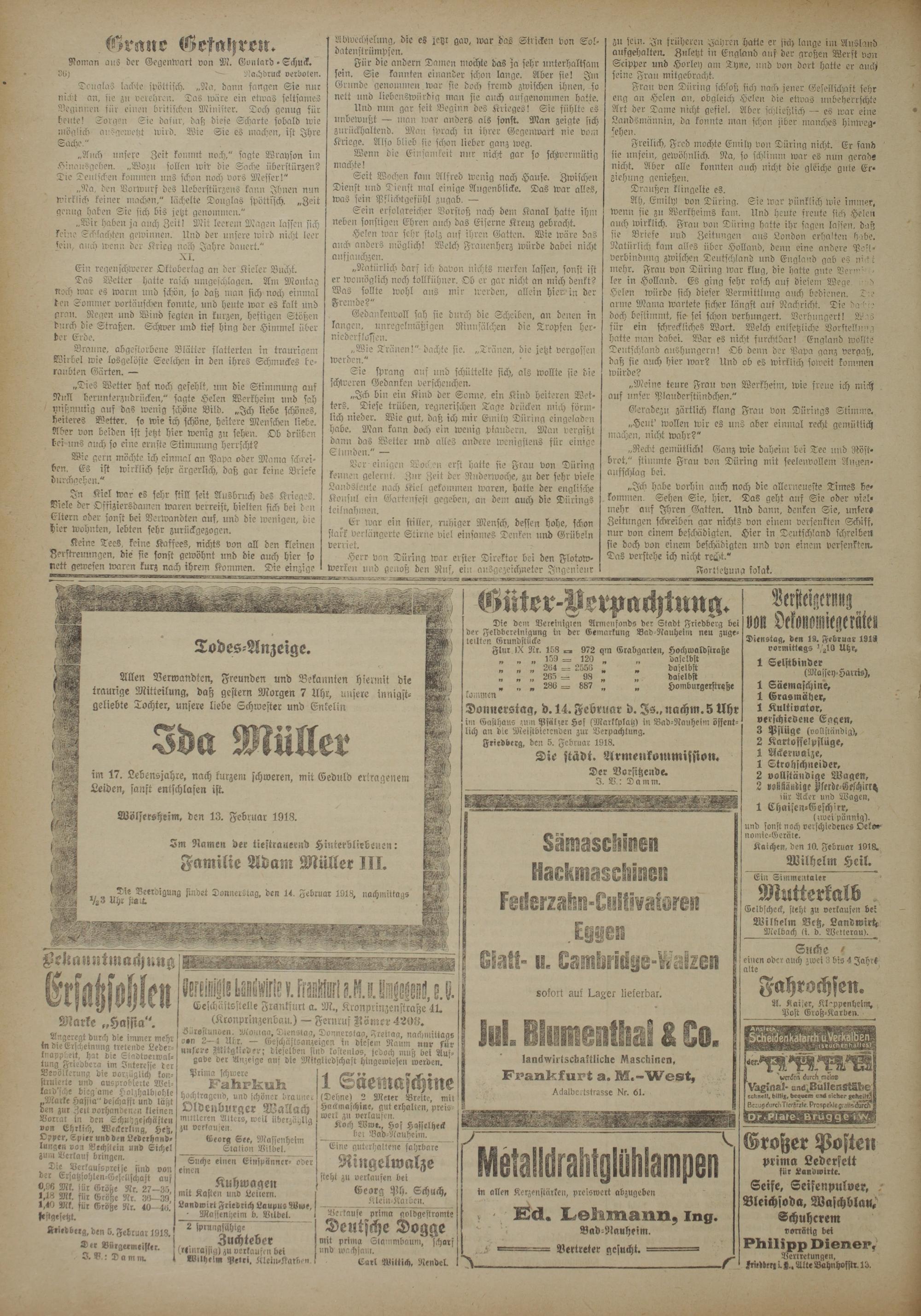 ,, .. Beerdigung findet Donnerstag, den 14. Februar 1918, nachmittags Vs 3 Uhr jtait