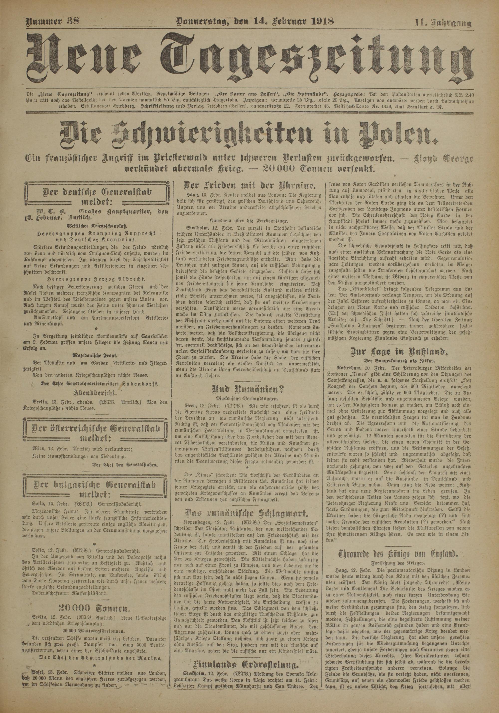 Haag, 13. Febr. Reuter meldet aus London: Die Regierung hält sich für genötigt, den zwischen Deutschland und Oesterreich- Ungarn und der Ukraine andererseits abgeschlossenen Frieden anzuerkennen.