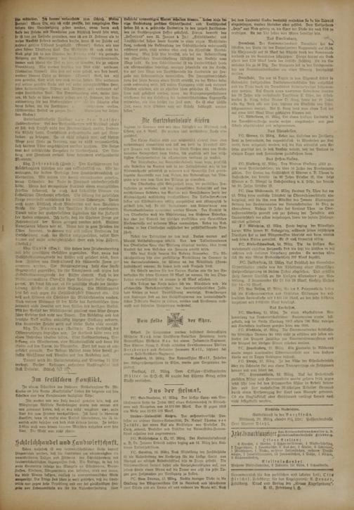 FC. Treusa. 17. März. In der Nahe der Eisenbahnörücks über die Schwalm siel aus einem Transportzuge ein Feldgrauer heraus und war sofort tot.