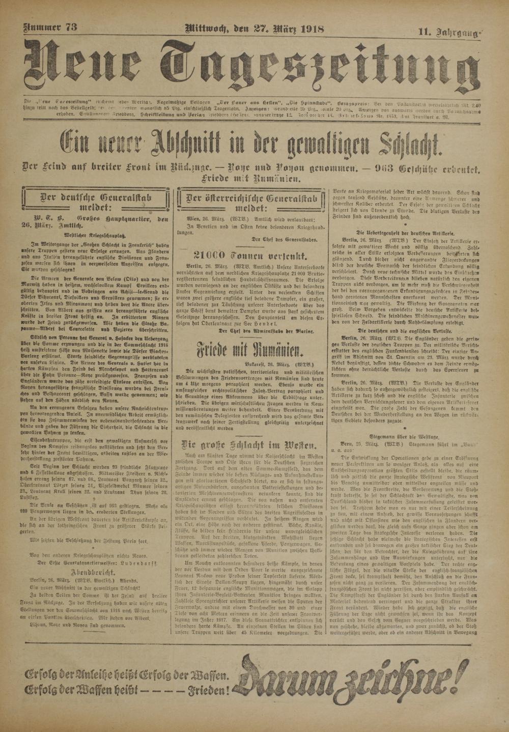 umstrittene Höhe von Maisonette sowie die Dörfer Biaches- Varleux erstürmt. Starke feindliche Gegenangriffe verbluteten vor unseren Linien. Die Armee des Generals o. Hutier hat in harten Kämpfen den Feind bei Marchelepot nnd Hattencourt Über die Pahn Peronne—Roys zurückgeworfen. Franzosen und Engländern warde das zähe verteidigte Etalone entrisien. Don Stoyon herangeführte französische Divisionen wurden bei Fren:- ches und Bethaucourt geschlagen. Busiy wurde genommen; wir stehen auf den Höhen nördlich von Noyon,