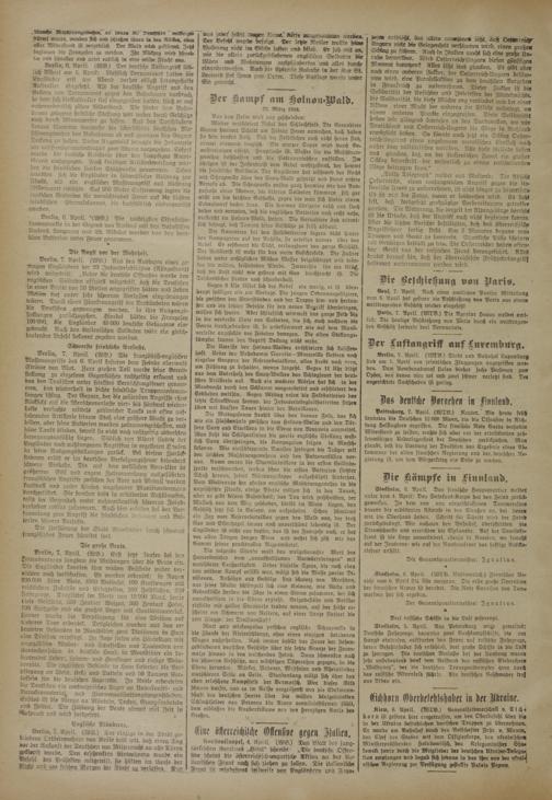 Petersburg, 7. April. (WTV.) Reuter. Bis heute früh landeten die Deutschen 12 000 Mann, die die Offensive in Richtung Helsingfors ergriffen. Die finnische Rote Garde versuchte Widerstand zu Leisten, mußte sich aber vor der erdrückenden zahlenmäßigen Ueberlegenheit der Deutschen Zurückziehen. Man glaubt, daß die Landung der Deutschen das Ergebnis eines Abkommens der alten finnischen Regierung und der deutschen Regierung ist, um dem Bürgerkrieg ein Ende zu machen.