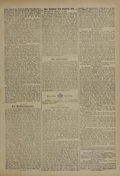 FC. Flörsheim. 1. Mai. Am letzten Sonntag wurde am Hellen Tage während des Hochamtes in einem Haufe der Hauptstraße eine Bettdecke gestohlen. Nachbarsleute sahen, wie der Dieb im Zimmer, gemütlich feine Zigarre rauchte, die Bettdecke über den Kopf schlug und das Haus verließ. Man ließ ihn ruhig Ziehen, in der Annahme, daß ihm die Decke gehöre oder er sie doch rechtmäßig erworben habe. Der Irrtum klärte sich bald auf.