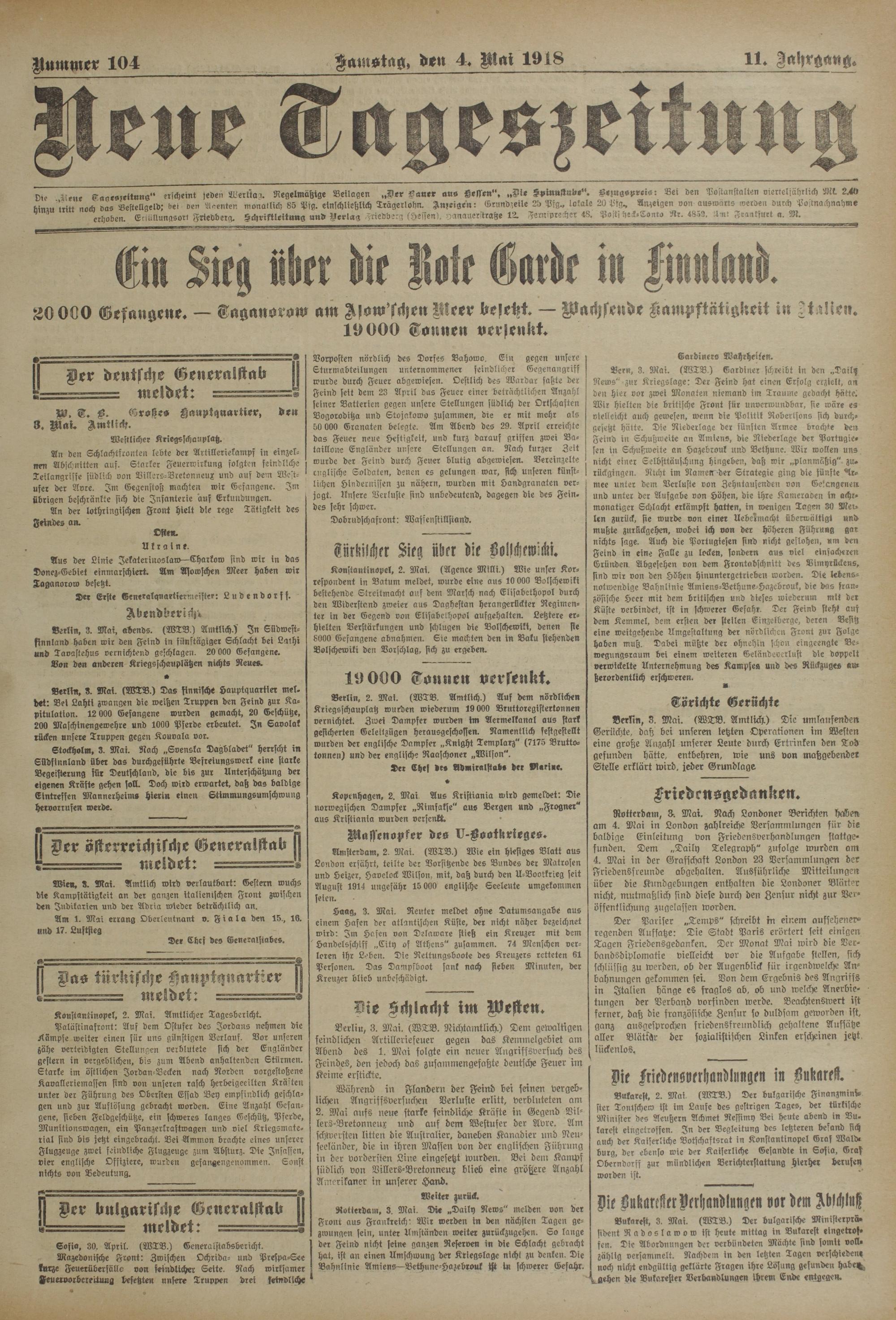 Berlin. 3. Mai, abends. (MTB.) Amtlich.) In Südwestfinnland haben wir den Feind in fünftägiger Schlacht bei Lathi und Tavastehus vernichtend geschlagen. 20 060 Gefangene.