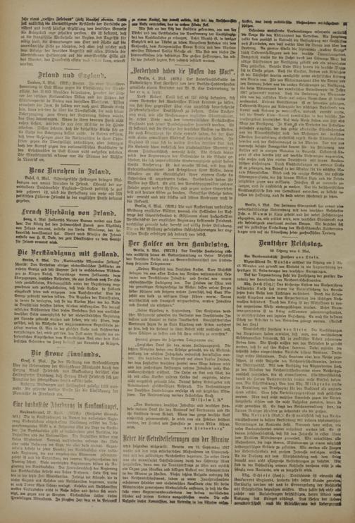 Haag. 6. Mai Hollandsch Nieuws Bureau meldet aus London: Der König hat den Feldmarschall French zum Vizekönig von Irland ernannt, anstelle des Lords Wimborne, der bekanntlich demissioniert hat. Shortt wird Minister für Irland »»stelle von H. E. Duke, der zum Oberstrichter an dem Gericht für Irland ernannt wird.