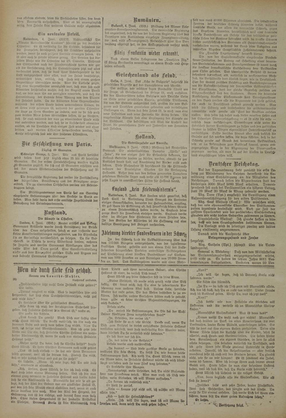 Schweizer Grenze, 5. Juni. Wie aus Paris berichtet wird fallen dort jetzt täglich etwa 35 bis 40 feindliche Granaten. Bei der ersten Fernbeschießung wurden täglich «JO Granaten gezählt, die sich auf 15 Granaten erhöhten und bei der neuen Wiederaufnahme der Beschießung auf 36 Granaten.