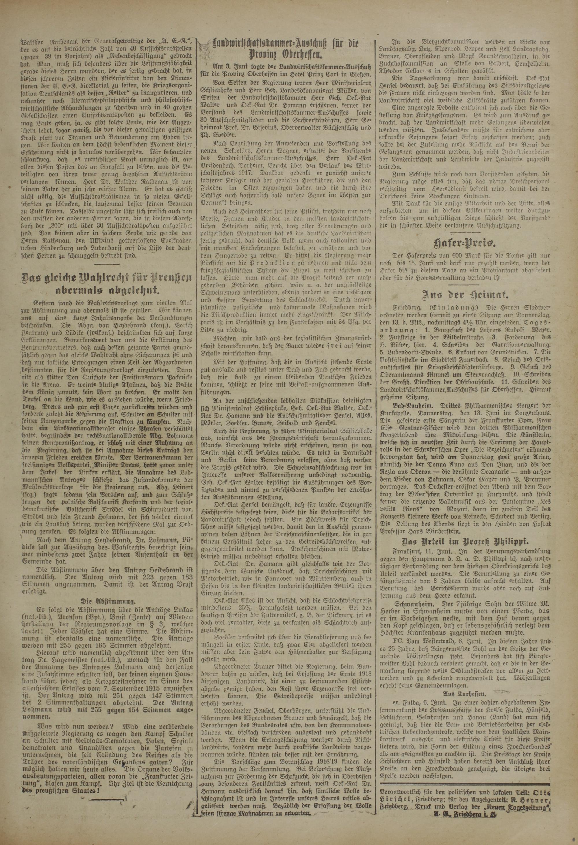 Rach Begrüßung der Anwesenden und Vorstellung des neuen Sekretärs, Herrn Wagner, ei stattet der Vorsitzende des Landwirtschaftskammer-AusschuUs, Herr Oek -Rat Breidenbach, Dorheim, Bericht über den Verlauf des Wirtschaftsjahres 1917. Dankbar gedenkt er zunächst unserer tapferer Krieger und der genialen Heerführer, die uns den Frieden im Osten erzwungen haben nnd die durch ihre Schläge auch hoffentlich bald unsere Ggner im Westen zur Vernunft bringen.