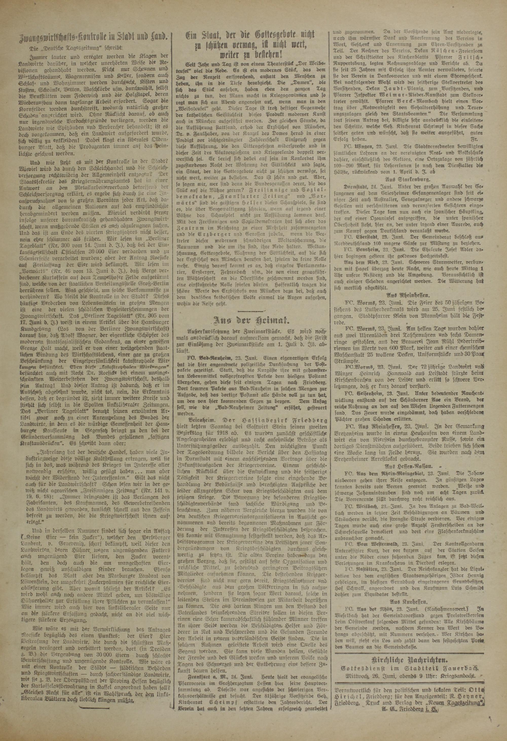 Verantwortlich für den polittschen und lokalen Teil: Otttj Hirsche!, Friedberg; für den Anzeigenteil: R. Heyner. Friedberg. Druck und Verlag der „Neuen TaaeLLeitunaH A. <&. Friedberg Ufr,