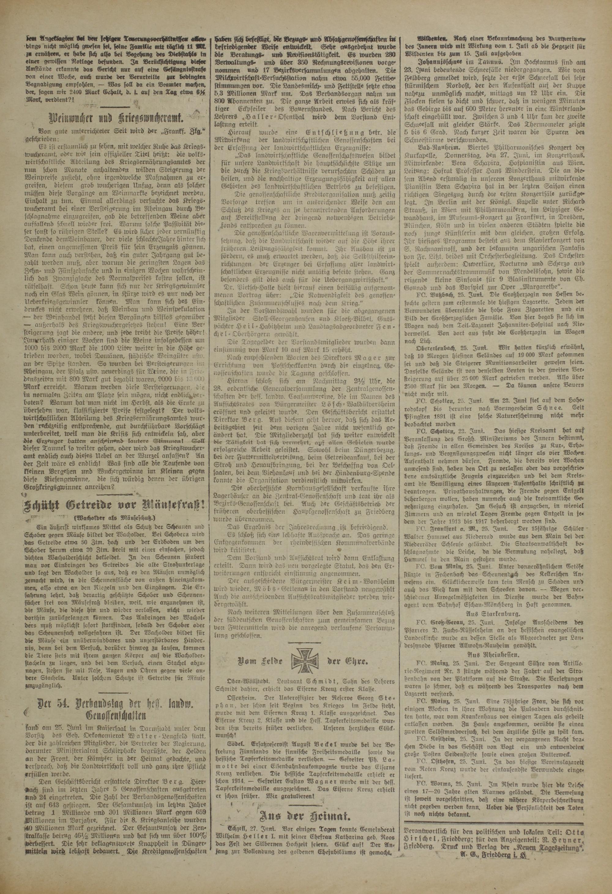 Verantwortlich fiir den politischen und lokalen Teil: Otto H i r s ch e l . Friedberg; fiir den Anzeigenbeil: R. H e y n e r. Friedberg. Druck und Verlag der „Neuen Tageszeifimg^. A- G., Friedberg i «8^ '