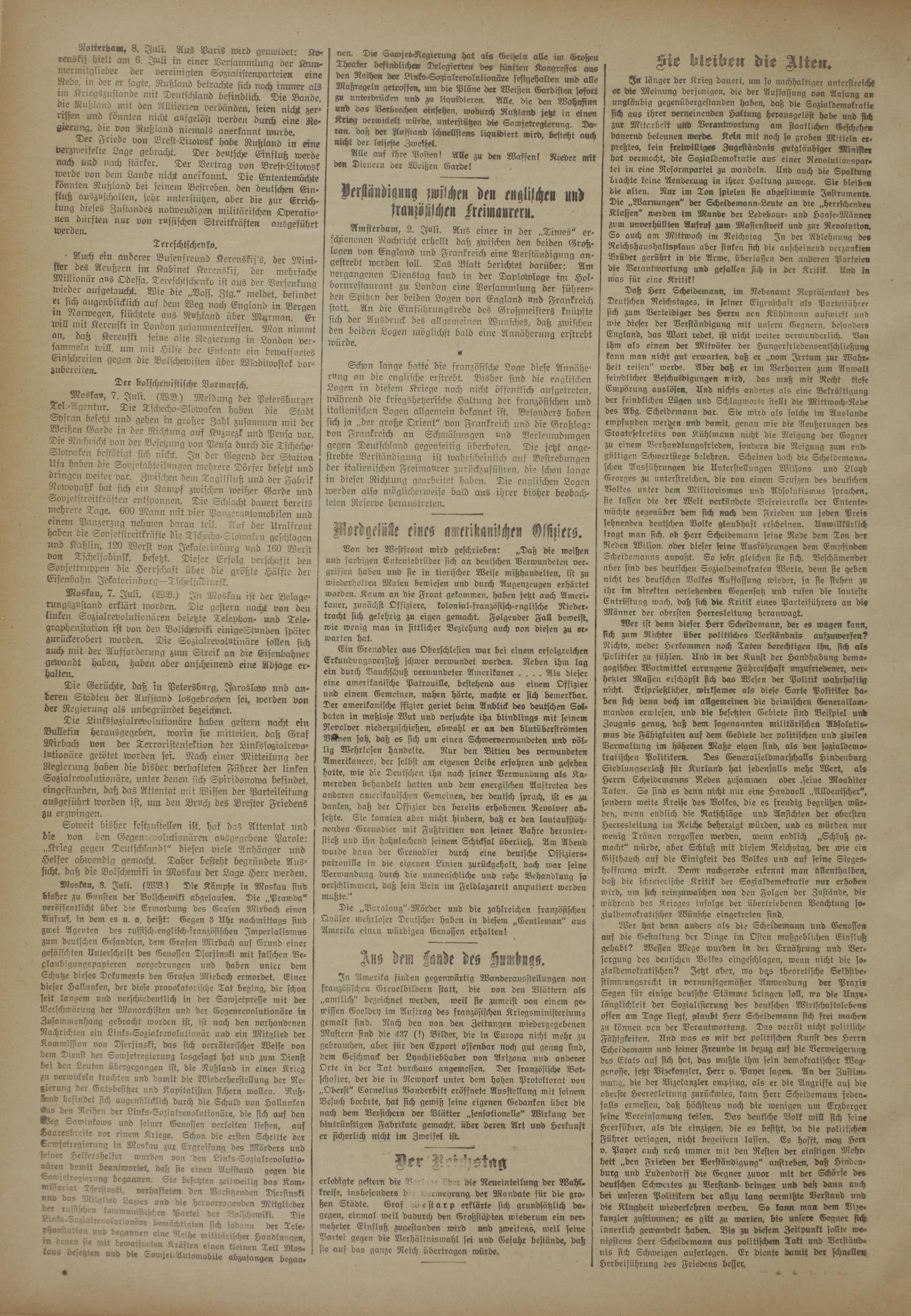 Moskau, 8. Juli. (WB.) Die Kampfe in Moskau sind bisher zu Gunsten der Bolschewiki abgelausen. Die „Prawda" veröffentlicht über die Ermordung des Grafen Mirbach einen Auffuf, in dem es u. a. heißt: Gegen 3 Uhr nachmittags sind zwei Agenten des russisch-englisch-französischen Imperialismus zum deutschen Gesandten, dem Grafen Mirbach auf Grund einer gefälschten Unterschrift des Genosien Dferjinski mit falschen Be- xlaubigungspapieren vorgedrungen und haben unter dem Schutze dieses Dokuments den Grafen Mirbach ermordet. Einer dieser Hallunken, der diese provokatorische Tat beging, die schon seit langem und verschiedentlich in der Sowjetpresse mit der Verschwörung der Monarchisten und der Gegenrevolutionäre in Zusammenhang gebracht worden ist, ist nach den vorhandenen Nachrichten ein Links-Sozialrevolutionär und ein Mitglied der Kommission von Dserjinski, das sich verräterischer Meise von dem Dienst der Sowjetregierung losgesagt hat und zum Dienst bei den Leuten übergegangen ist, die Rußland in einen Krieg zu verwickeln trachten und damtt die Wiederherstellung der Negierung der Gutsbesitzer und Kapitalisten sichern wollen. Ruß- 8cvnd bestndet sich augenblicklich durch die Schuld von Hallunken Ars den Reihen der Links-Sozialrevolutionäre, die sich auf den Weg Sawinkows und seiner Genosien verleiten ließen, auf Haaresbreite vor einem Kriege. Schon die ersten Schritte der kowjetregierung in Moskau zur Ergreifung des Mörders und senior Helfershelfer wurden von 'den Links-Sozialrevolutio- «ären damtt beantwortet, daß sie einen Aufstand gegen die Eowjetregierung begannen. Sie besetzten zeitweilig das Kom- mr^arrat Dfirsinski, verhafteten den Vorsitzenden Dfersinski