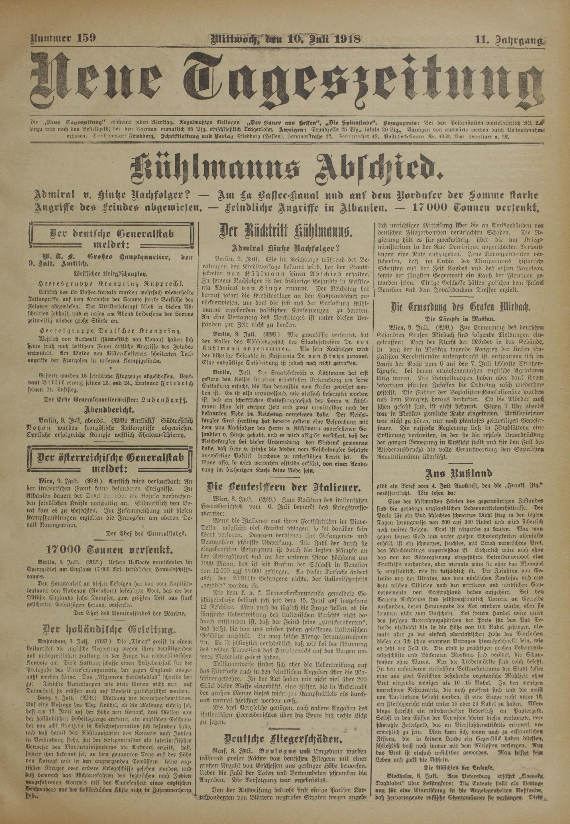 Berlin, 9. Juli. Wie im Reichstage während der Be- ratuugen der K'reditvorlage bekannt wird, hat der Staatssekretär von Kühl mann seinen Abschied erhalten. Zu seinem Nachfolger ist der bisherige Gesandte in Kristiania Admiral von H i n tz e ernannt. Der Reichstag hat darauf sofort die Kreditvorlage an den Hauptausschuß zurückverwiesen, um dort die sich aus der Entlassung Kühlmanns ergebenden politischen Konsequenzen zu beraten. An eine Vertagung des Reichstages ist unter diesen Umständen zur Zeit nicht zu denken.