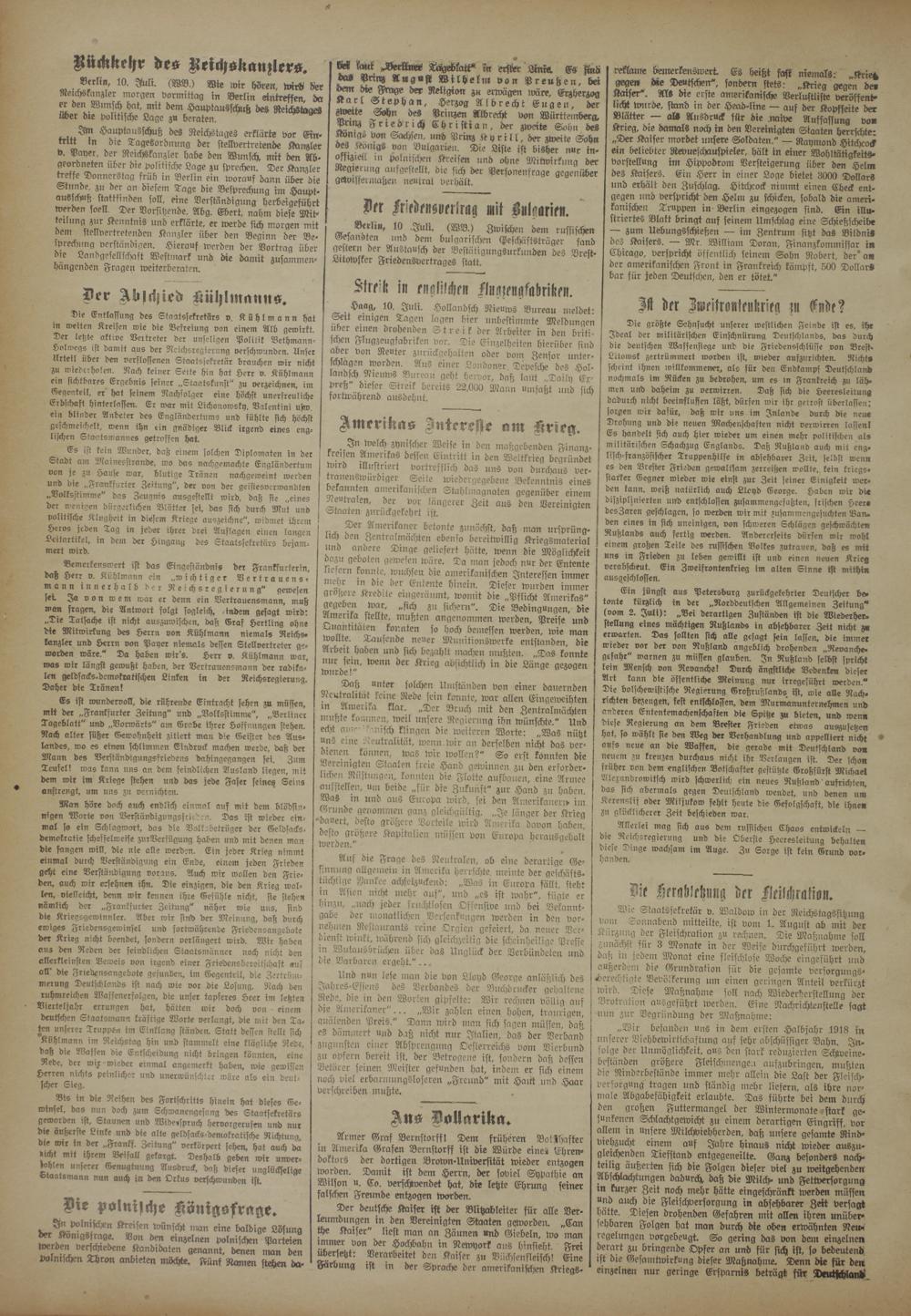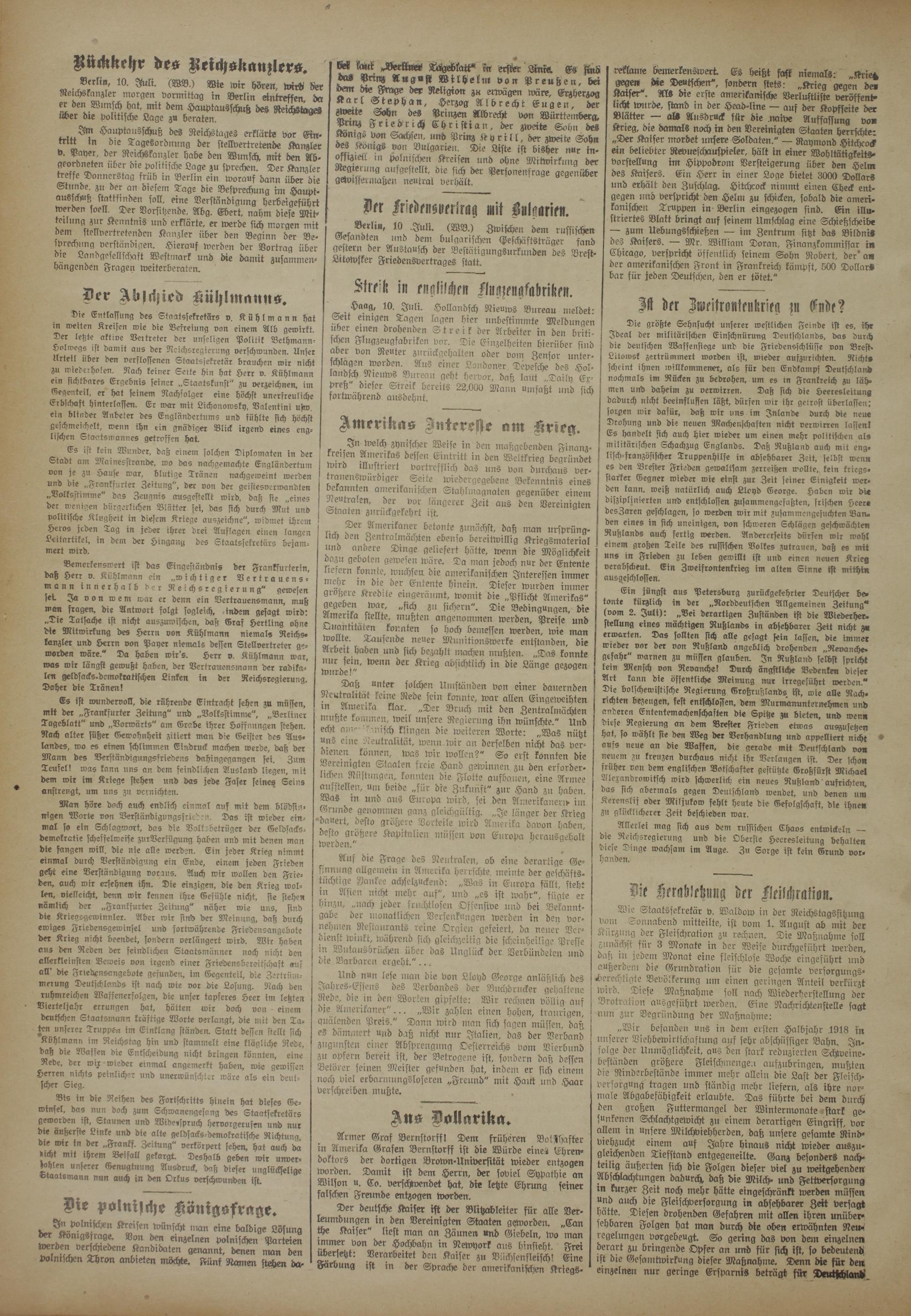 Die Entlassung des Staatssekretärs v. Kühlmann hat in weiten Kreisen wie die Befreiung von einem Alb gewirkt. Der letzte aktive Vertreter der unseligen Politik Bethmann- Holwegs ist damit aus der Ncichsregierung verschwunden. Unser Urteil über den verflossenen Staatssekretär brauchen wir nicht zu wiederholen. Nach keiner Seite hin hat Herr v. Kühlmann ein sichtbares Ergebnis seiner „Staatskunst" zu verzeichnen, im Gegenteil, er hat seinem Nachfolger eine höchst unerfreuliche Erbschaft hinterlassen. Er war mit Lichonowsky, Valentin! u'pv. ein blinder Anbeter des Engländertums und fühlte sich höchst geschmeichelt, wenn ihn ein gnädiger Blick irgend eines englischen Staatsmannes getroffen hat.
