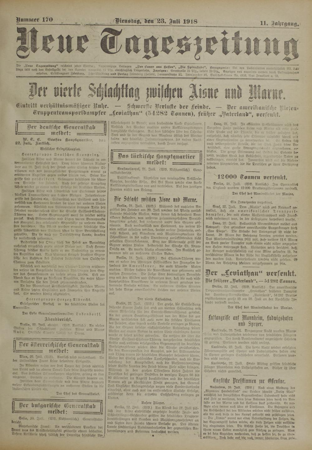 Zwischen Aisne und Marne dauert die Schlacht in unverminderter Heftigkeit fort. Trotz seiner schweren Niederlage am 20. Juli stieß der Feind unter Einsatz frischer Divisionen und neu he rau geführter Panzerwagen erneut zu erbitterten Angrffen gegen unsere Linien vor. Seine Angriffe sind gescheitert. Gefangene bestätigen die schweren Verluste des Feindes. Auch der gestrige Kampftag führte wieder zu einem vollen Erfolge der deutschen Waffen.