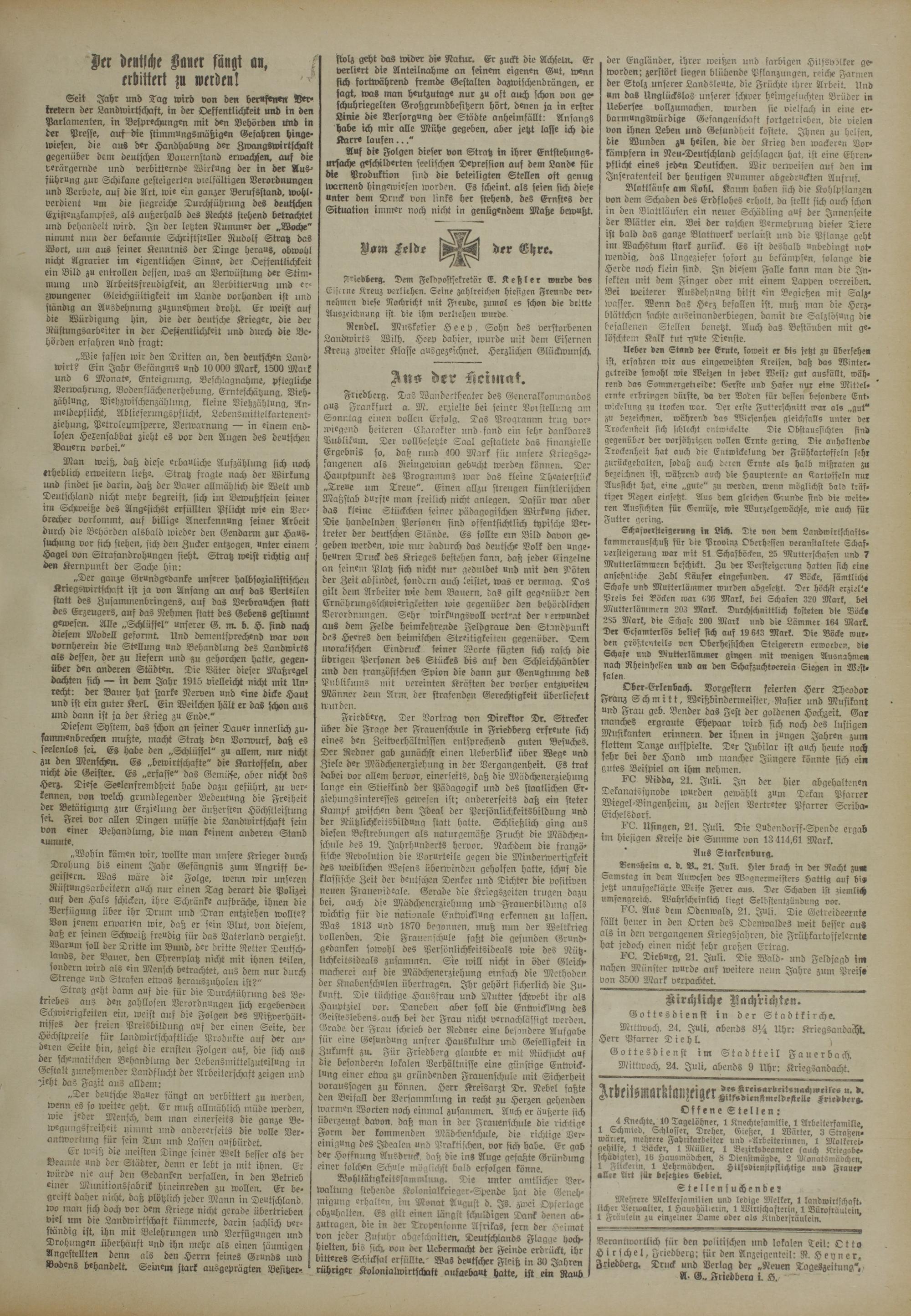 Verantwortlich für den politischen und lokalen Teil: Otto H i r j ch e l, Friedderg; für den Anzeigenteil: R. H e y n e r.