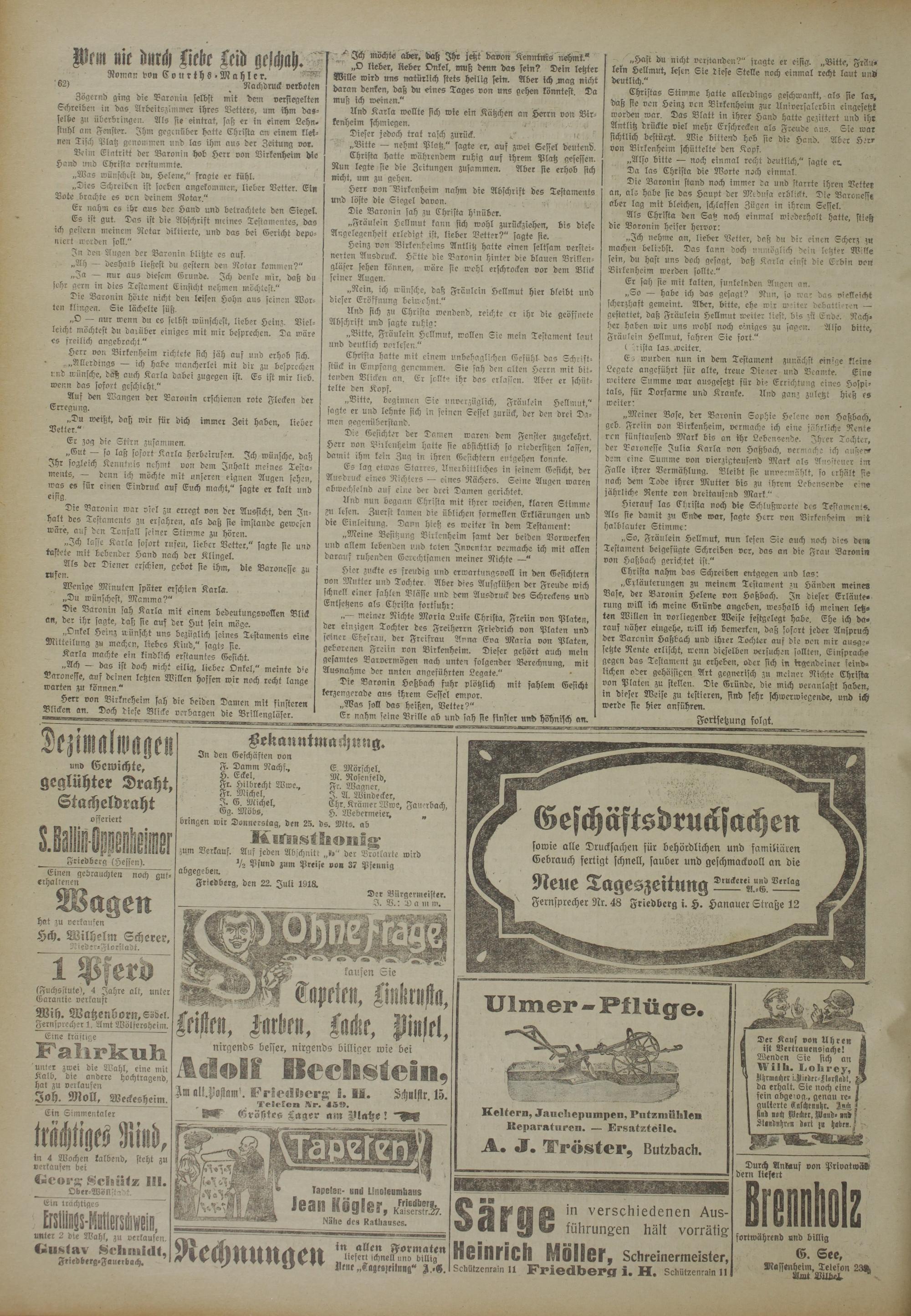 abgea-ben ^ ^ unö 3Mm ^"ise von 37 Pfennig Friedberg, den 22. Juli 1918.