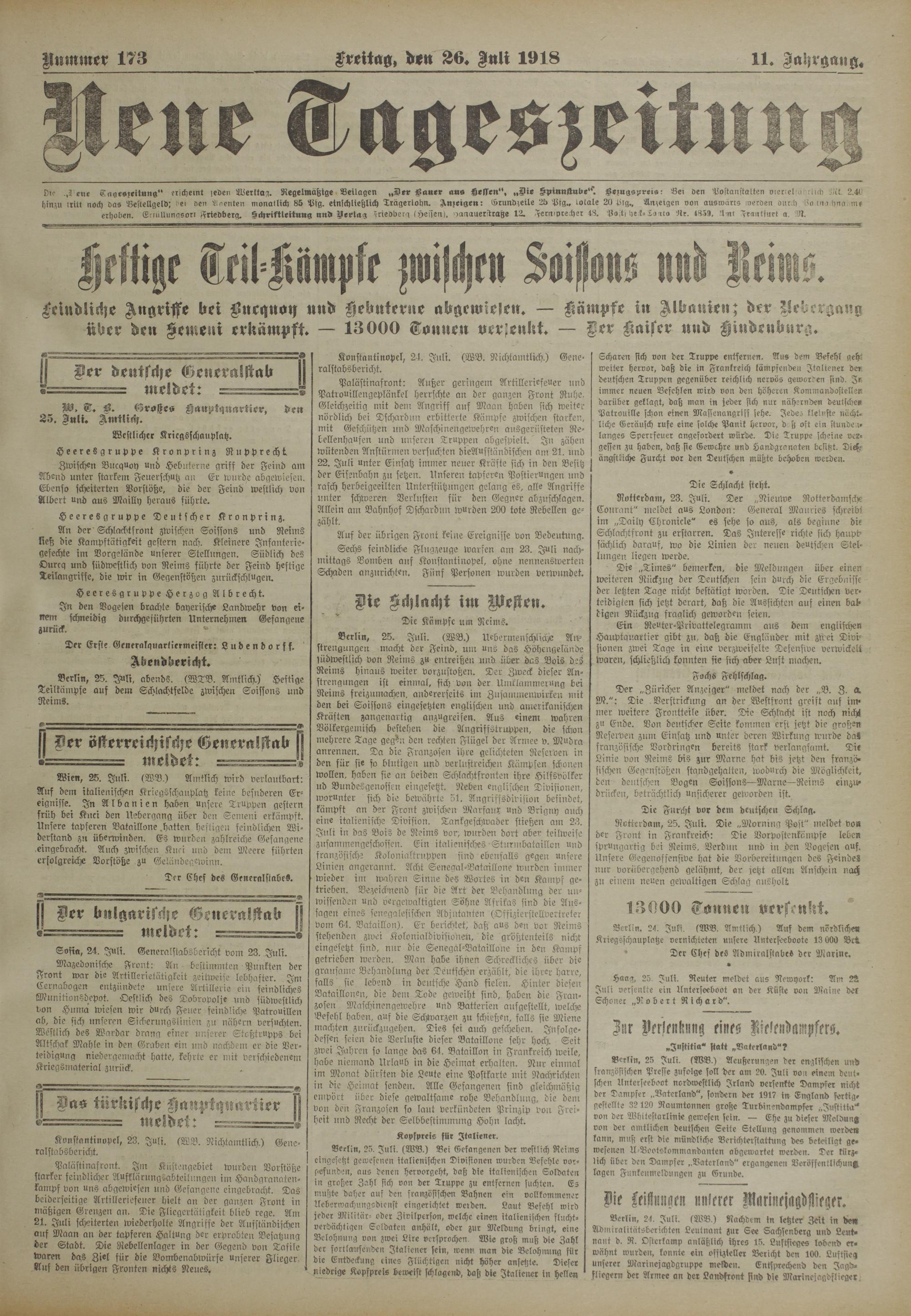 An der Schlachtfront zwischen Soissons und Reims ließ die Kampftätigkeit gestern nach. Kleinere Infanterie- gefechte im Vorgelände unserer Stellungen. Südlich des Ourcq und südwestlich von Reims führte der Feind heftige Teilangrifse. die wir in Gegenstößen zurückschlugen.