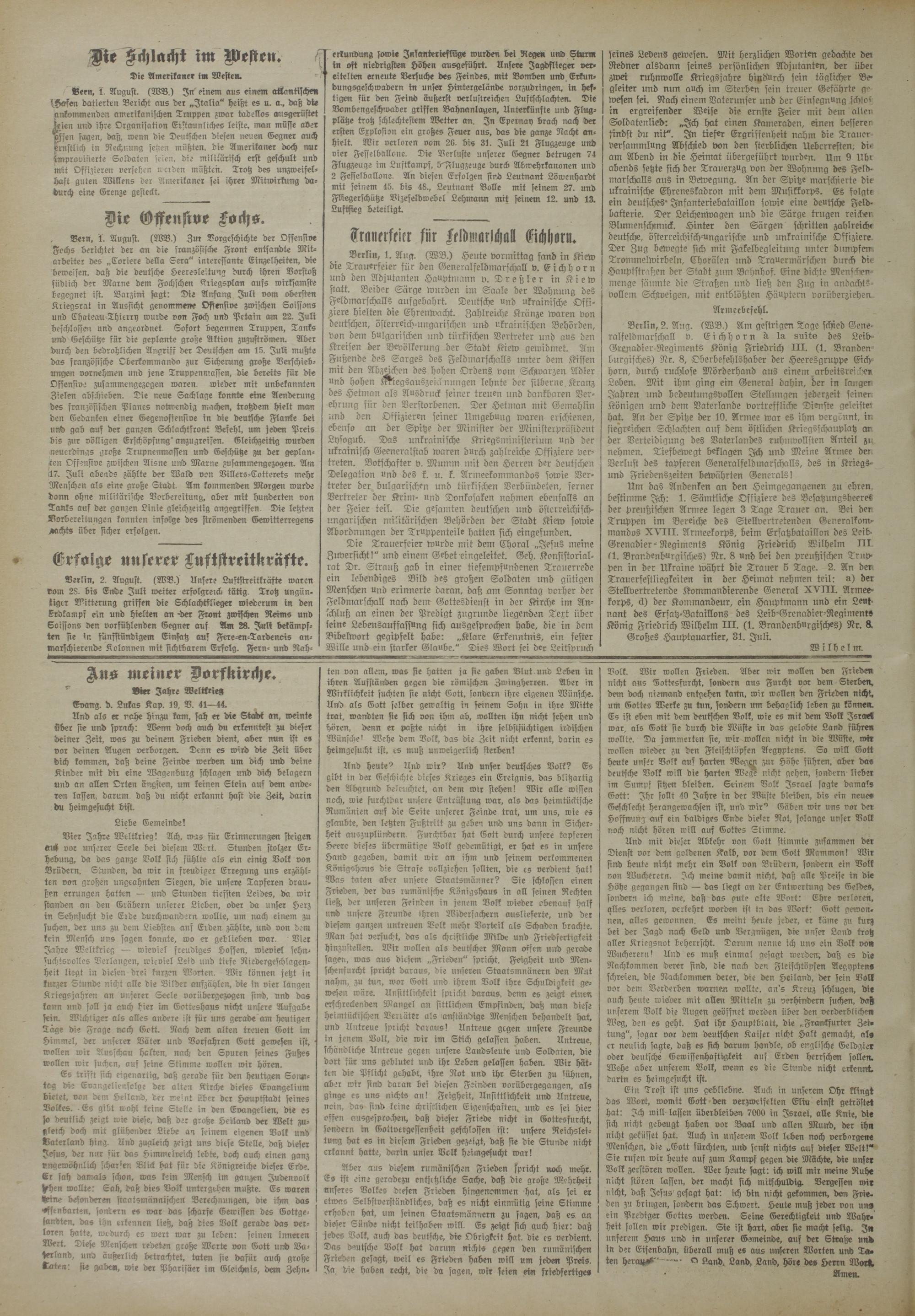 Berlin, 2. Aug. (WB.) Am gestrigen Lage schied Gene- ralfeldmarschall v. Eichhorn ü 1a suite des Leib- Grenadier-Regiments König Friedrich III. (1. Branden burgisches) Nr. 8, Oberbefehlshaber der Heeresgruppe Eich Horn, durch ruchlose Mörderhand aus einem,arbeitsreichen Leben. Mit ihm ging ein General dahin, der in laugen Jahren und bedeutungsvollen Stellungen jederzeit seiner Königen und dem Vaterlande vortreffliche Dienste geleistet hat. An der Spitze der 10. Armee war es ihm vergönnt, in siegreichen Schlachten auf dem östlichen Kriegsschauplatz ar der Verteidigung des Vaterlandes ruhmvollsten Anteil jr. nehmen. Tiefbewegt beklagen Ich und Meine Armee der Verlust des tapferen Generalfeldmarschalls, des in Kriegs- und Friedenszeiten bewährten Generals!