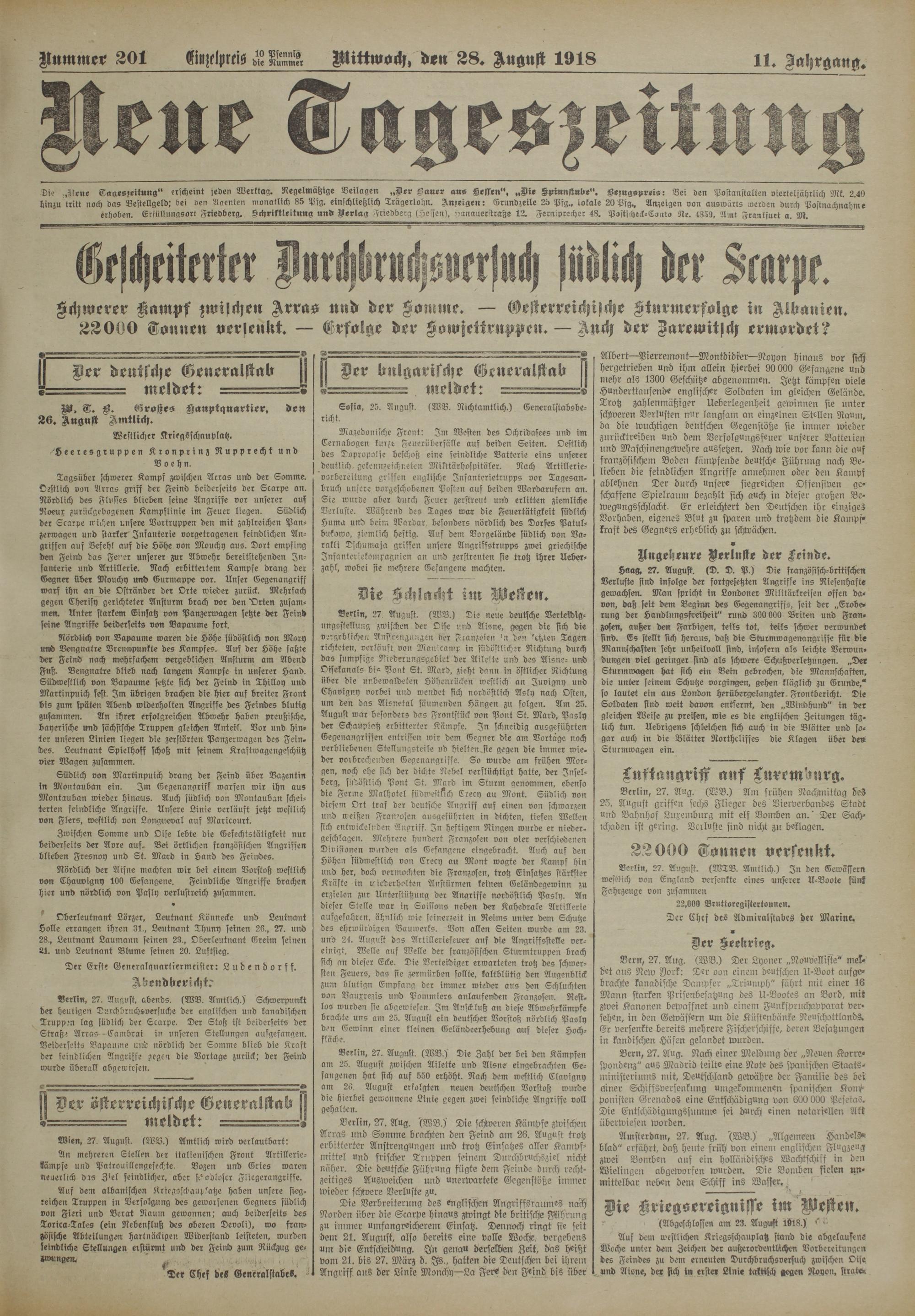 Berlin, 27. Aug. '(WV.)' Die schweren Kämpfe zwischen Arras und Somme brachten den Feind am 26. August trotz erbitterter Anstrengungen und trotz Einsatzes aller Kampfmittel und frischer Truppen seinem Durchbru>chsziel nicht näher. Die deutsche Führung ffigte dem Feinde durch rechtzeitiges Ausweichen und unerwartete Gegenstöße immer wieder schwere Verluste zu.