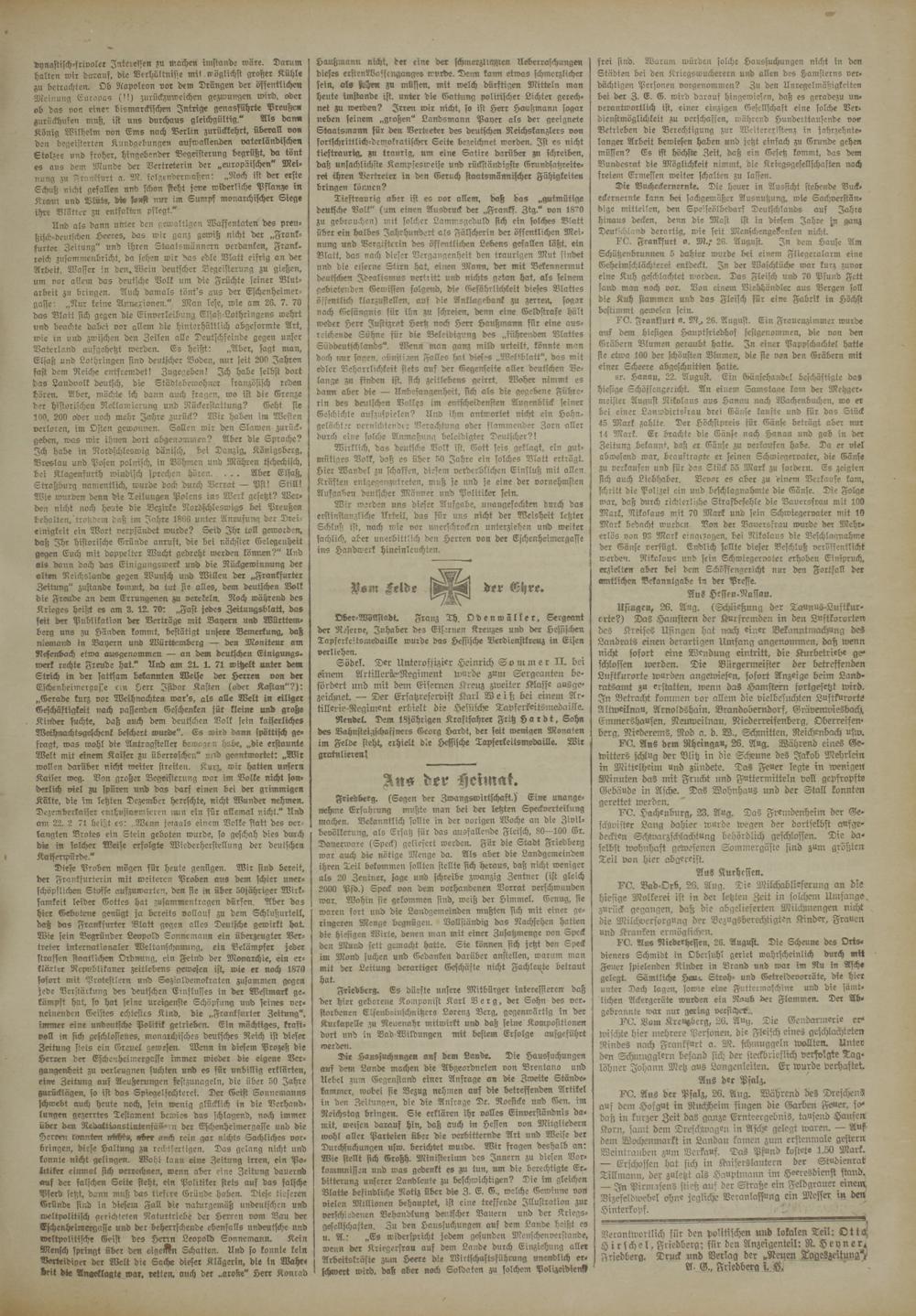Verantwortlich für den politischen und lokalen Teil: OttH Hirsche!, Friedberg; für den Anzeigenteil: R. Heyne Friedberg. Truck und Verlag der ^Nepen TageZzeituns^ A. G., Friedberg IJfJ