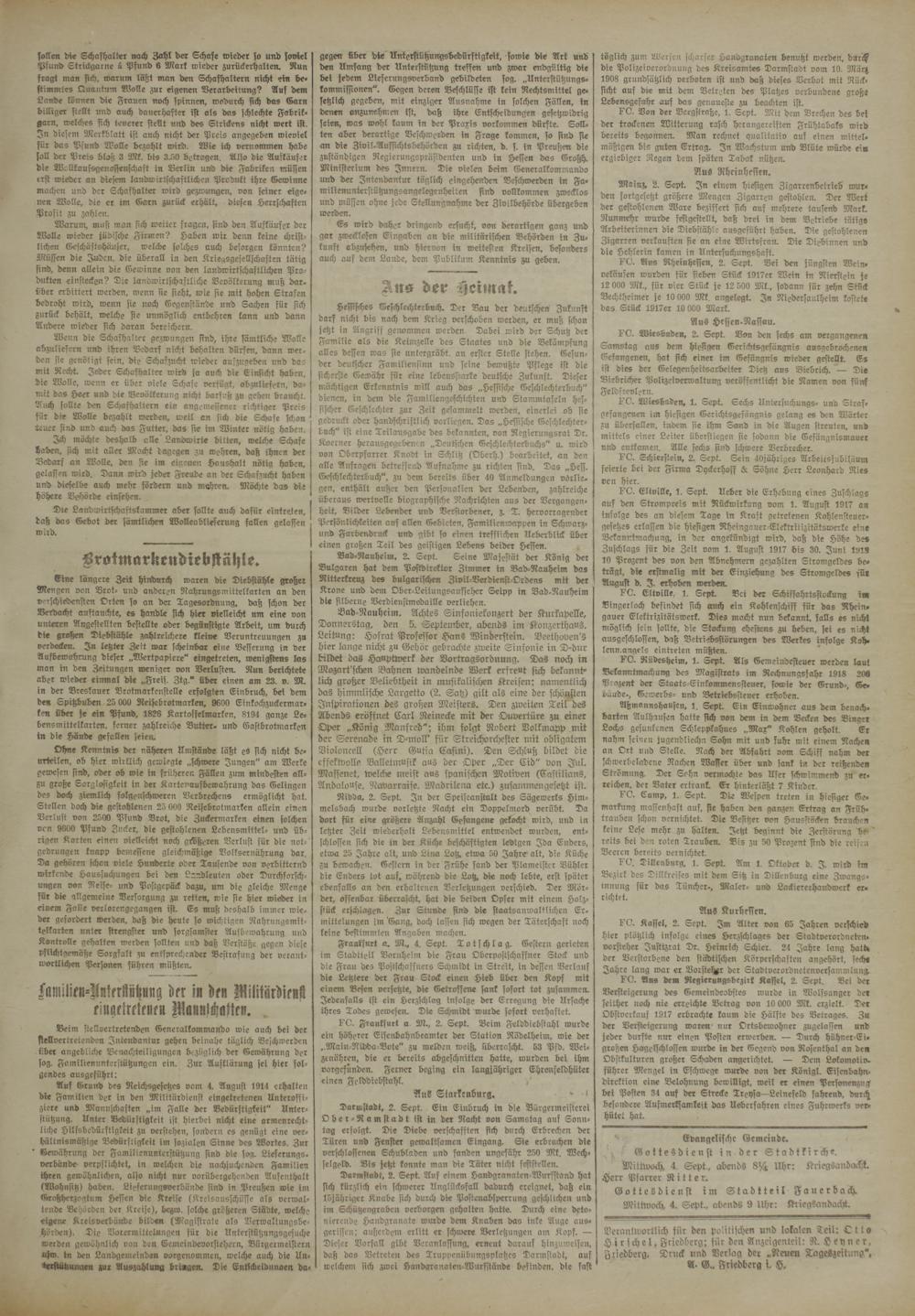 FC. Frankfurt a M., 2. Sept. Beim Felddiebstahl wurde ein höherer Eisenbahnbeamter der Station Rödelheim, wie der „Main-Nidda-Bote" zu melden weiß, überrascht. 53 Pfd. Weizenähren, die er bereits abgefchnitten hatte, wurden bei ihm vorgefünden. Ferner beging ein langjähriger Ehronfeldhüter einen Felddiebstahl.