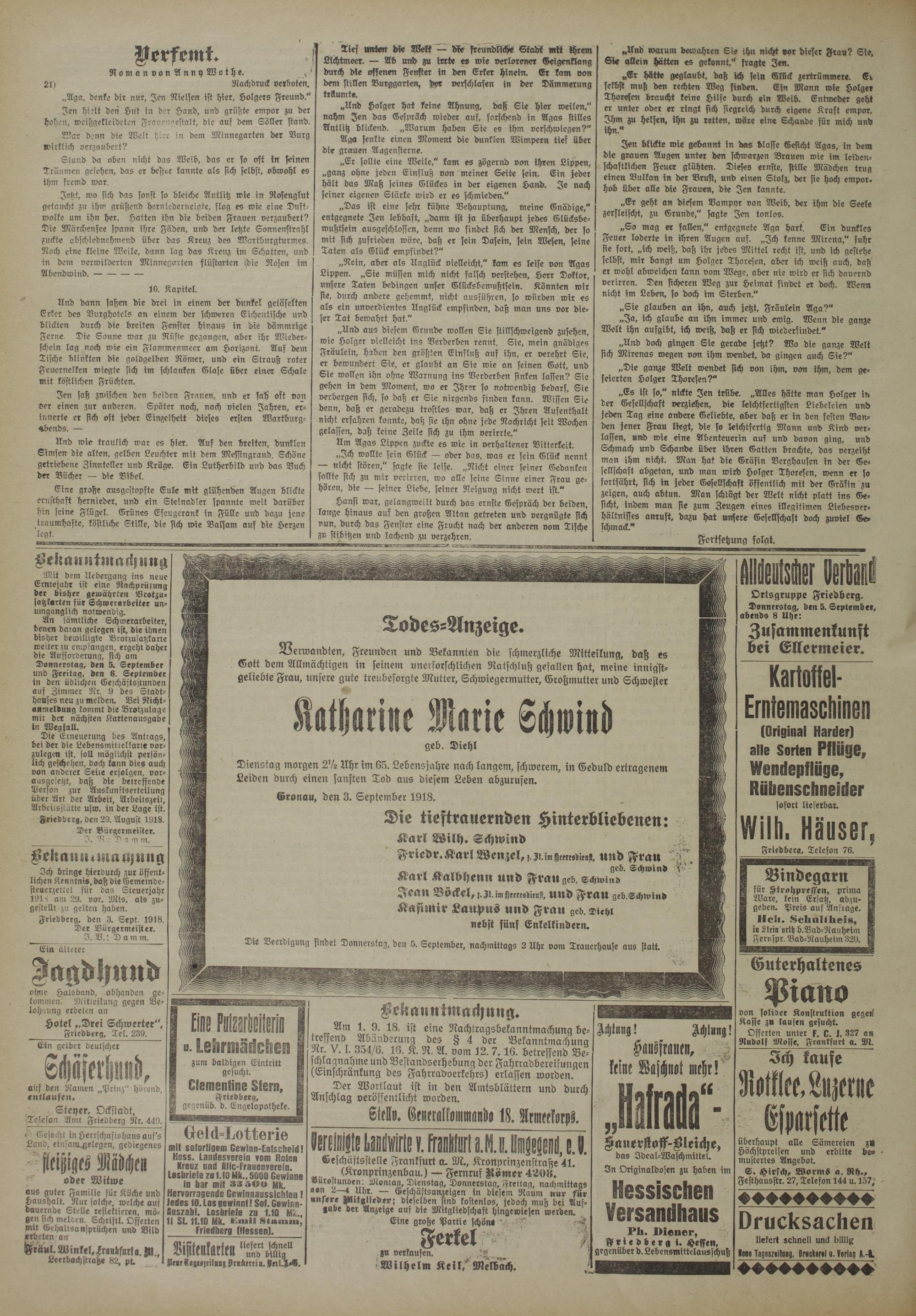 Die Beerdigung findet Donnerstag, den 5. September, nachmittags 2 Uhr vom Trauerhause aus statt.