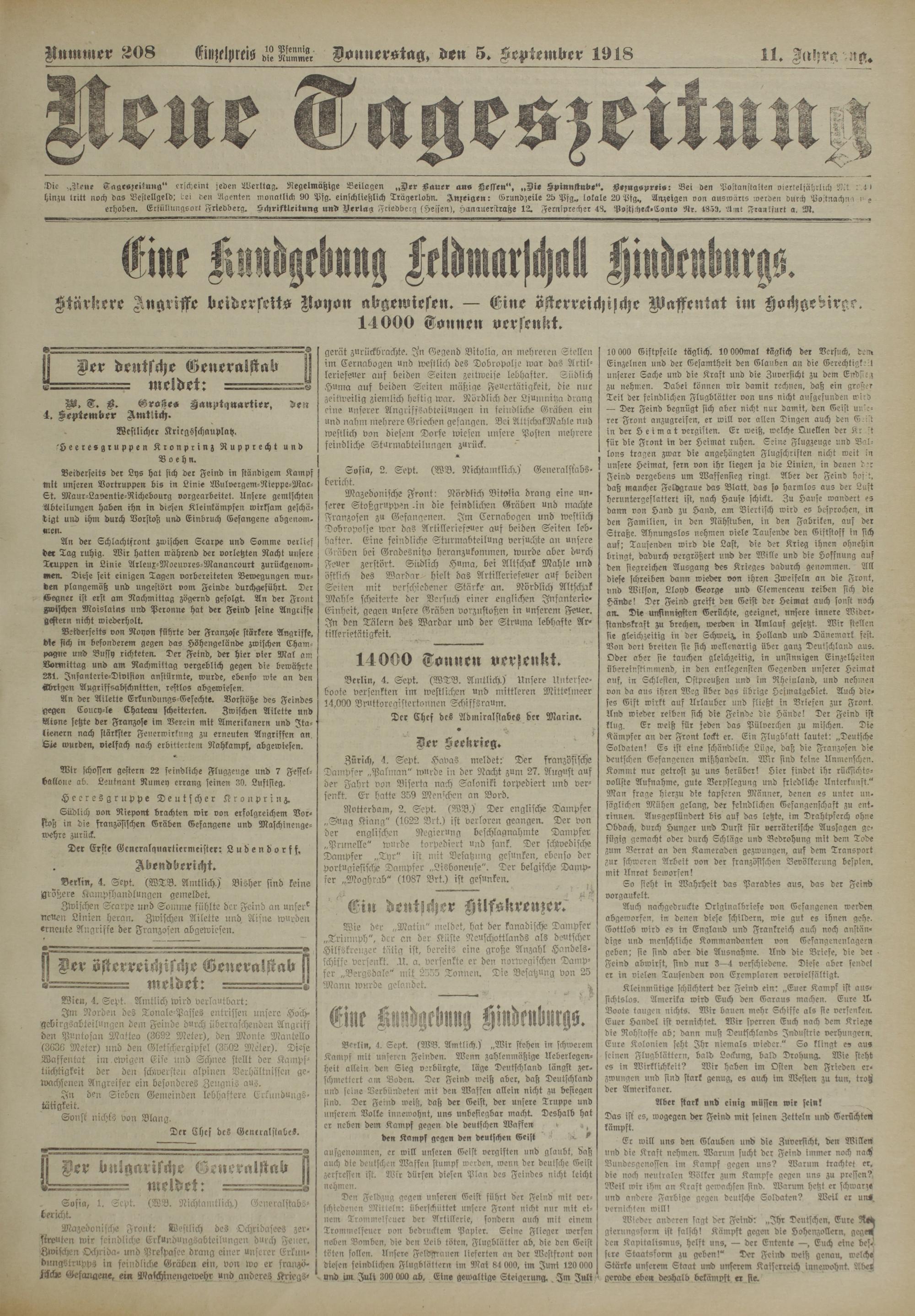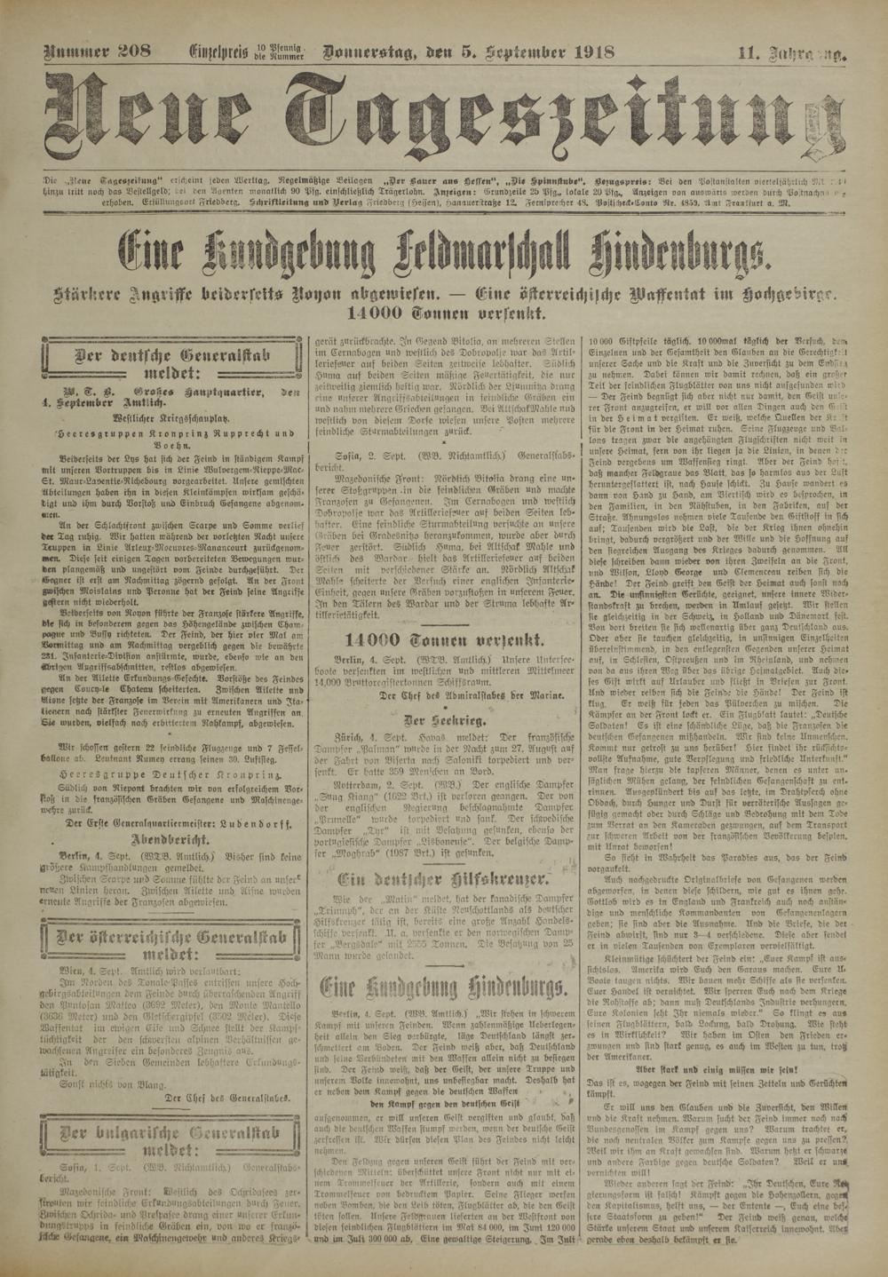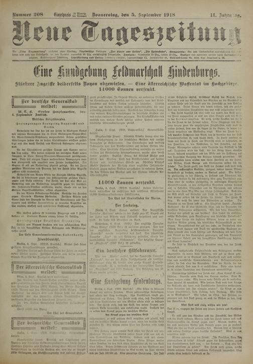Den Feldzug gegen unseren Geist führt der Feind mit verschiedenen Mitteln: überschüttet unsere Front nicht nur mit einem Trommelfeuer der Artillerie, sondern auch mit einem Trommelfeuer von bedrucktem Papier. Seine Flieger werfen neben Bomben, die den Leib töten, Flugblätter ab, die den Geist töten sollen. Unsere Feldgrauen lieferten an der Weststont von diesen feindlichen Flugblättern im Mai 84 000, im Juni 120 000 und un Juli 300 000 ab. Eine gewaltige Steigerung. . Im Juli -