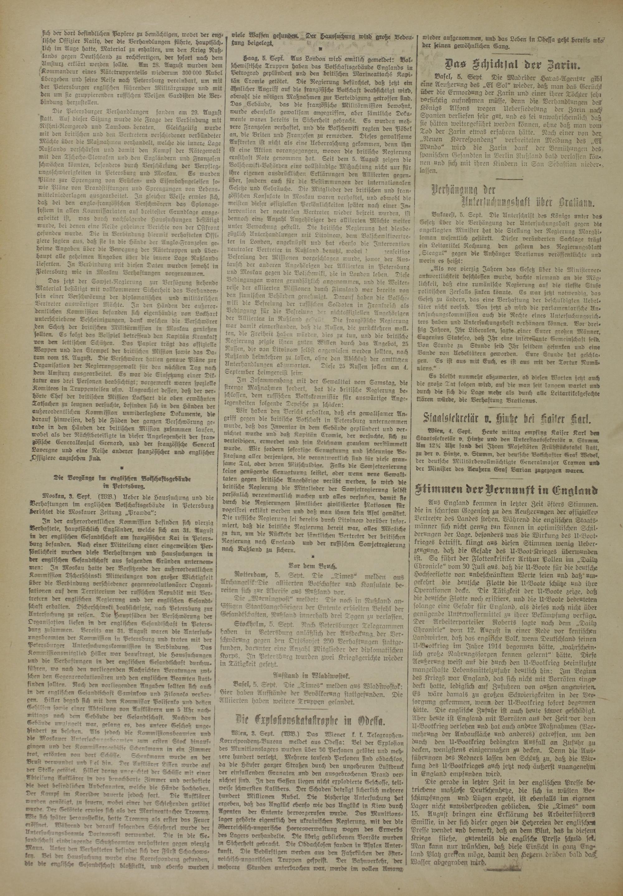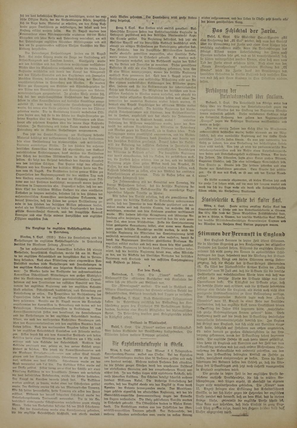 Wien, 4. Sept Heute mittag empfing Kaiser Karl den Staatssekretär v. Hintze und den Unterstaatssekretär v. Stumm. Um 12% Uhr fand bei Ihren Majestäten Frühstückstafel statt, zu der v. Hintze. v. Stumm, der deutsche Botschafter Gras Wedel, der deutsche Militärbevollmächtigte Generalmajor Cramon und der Minister des Aeußern Graf Burian zugezogen waren.