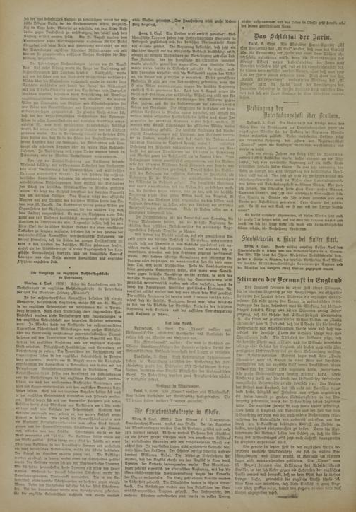 Wien. 3. Sept. (WB.) Das Wiener k. k. Telsgraphen- Korrespondenz-Bureau meldet aus Odessa: Bei der Explosion des Munitionslagers wurden über 50 Personen getötet und mehrere hundert verletzt. Mehrere lausend Personen sind obdachlos, da die Häuser ganzer Sttaßen durch den ungeheuren Luftdruck der einfallenden Granaten und den ausgebrochenen Brand vernichtet sind. In den Gassen liegen nicht explodierte Geschosse, teilweise schwersten Kalibers. Der Schaden bettagt sicherlich mehrere hundert Millionen Rubel. Die bisherige Untersuchung hat ergeben, daß das Unglück ebenso wie das Unglück in Kiew durch Agenten der Entente hervorgerufen wurde. Das Munitionslager gehörte eigentlich der ukrainischen Regierung, mit der die österreichisch-un-garische Heeresverwaltung wegen des Erwerbs des Lagers verhandelte. Die übrig gebliebenen Vorräte wurden in Sicherheit gebracht. Die Obdachlosen fanden in Asylen Unterkunft. Die Bedürftigen werden aus den Fahrküchen der öfter- veichischmngarifchen Truppen gespeist. Der Bahnverkehr, der mehrere Stunden unterbrochen war. wurde im vollen Umang