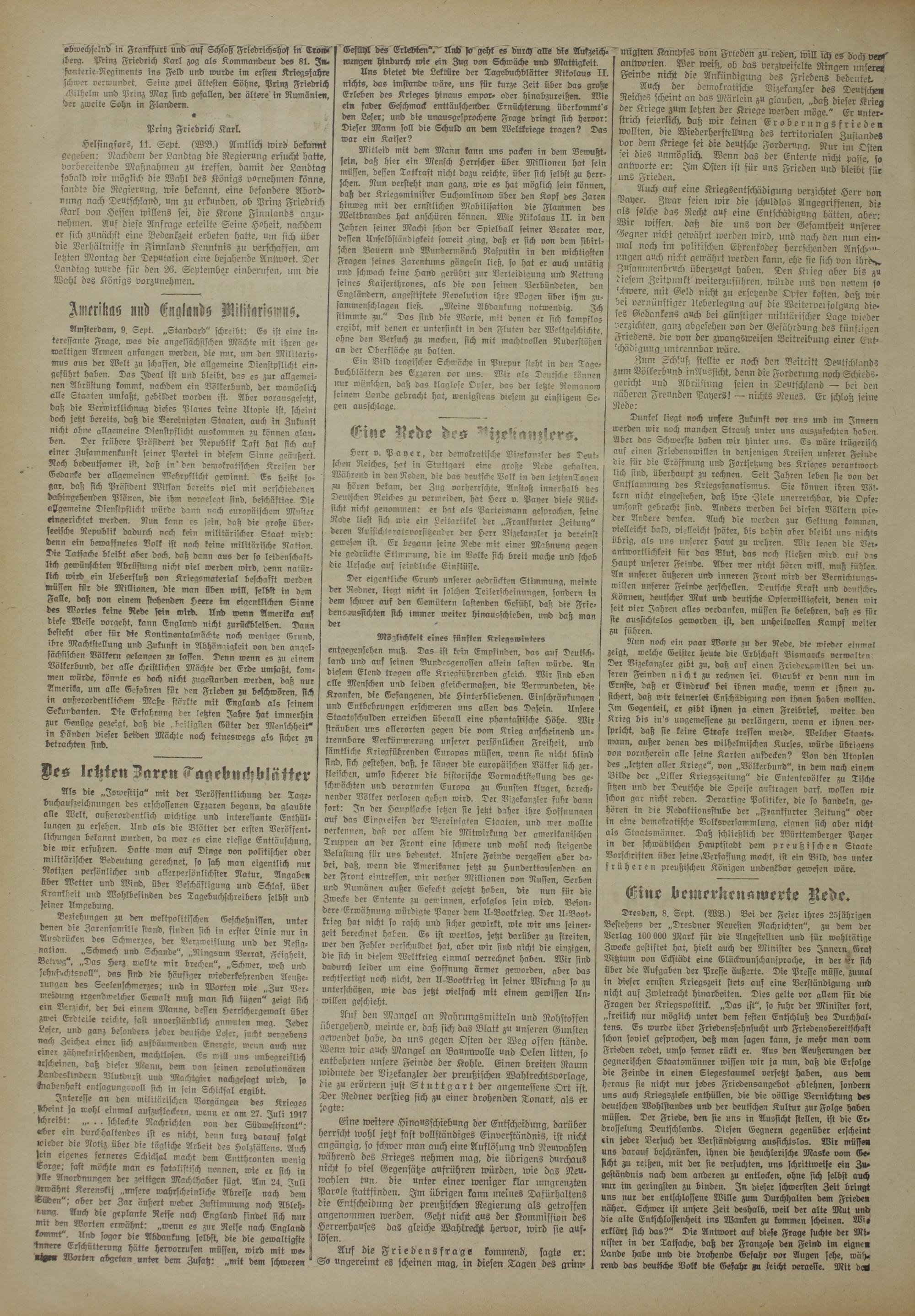 Helsin gfors, 11. Sept. (WB.) Amtlich wird bekannt gegeben: Nachdem der Landtag die Regierung ersucht hatte, vorbereitende Maßnahmen zu treffen, damit der Landtag sobald wir möglich die Wahl des Königs vornehmen könne, sandte die Regierung, wie bekannt, eine besondere Mord- vung nach Deutschland, um zu erkunden, ob Prinz Friedrich Karl von Hessen willens sei, die Krone Finnlands anzunehmen. Auf diese Anfrage erteilte Seine Hoheit, nachdem er sich zunächst eine Bedenkzeit erbeten hatte, um sich über die Verhältnisse in Finnland Kenntnis zu verschaffen, am letzten Montag der Deputation eine bejahende Antwort. Der Landtag wurde für den 26. September einbenifen, um die Wahl des Königs vorzunehmen.