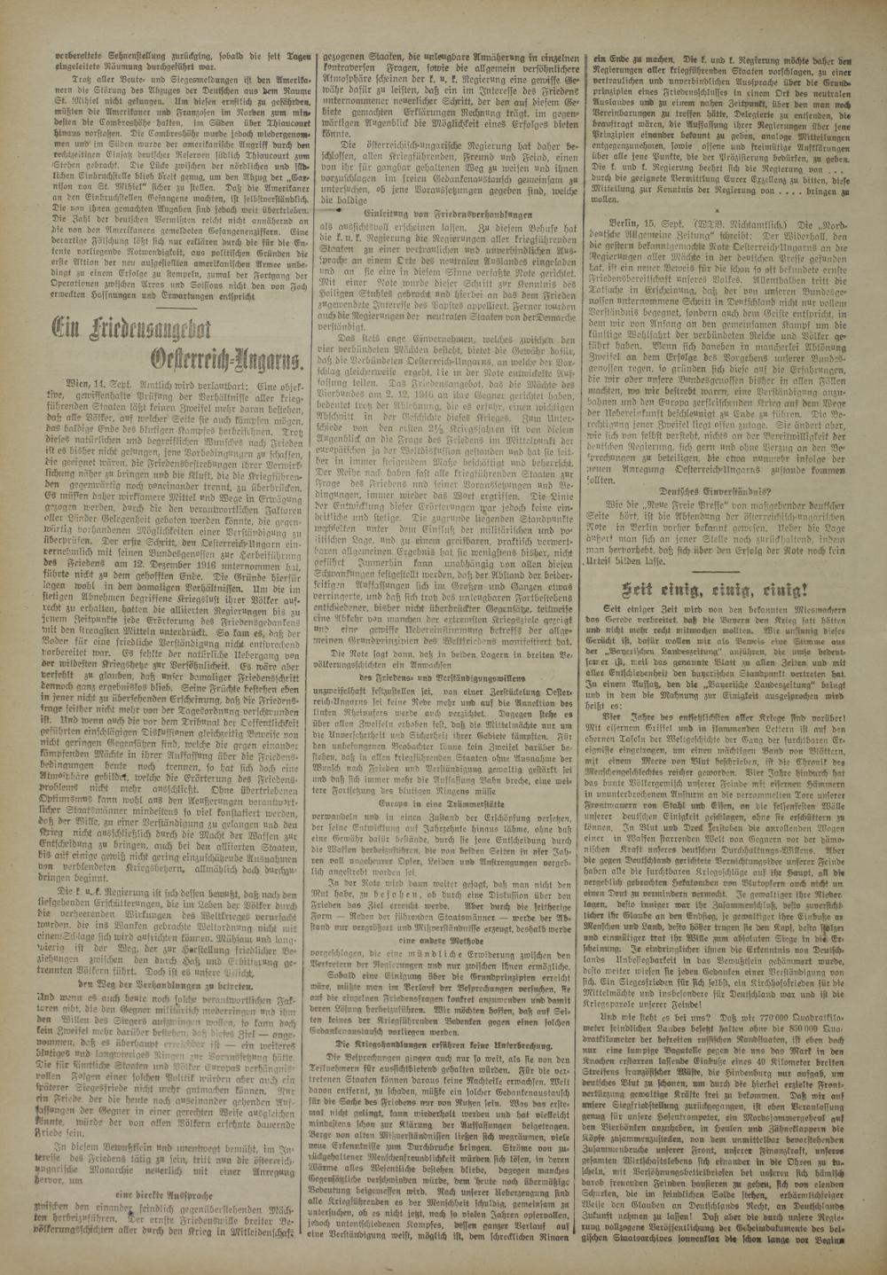 Wien, 14. Sept. Amtlich wird verlautbart: Eine objektive, gewissenhafte Prüfung der Verhältnisse aller krieg- führenden Staaten läßt keinen Zweifel mehr daran bestehen, daß alle Völker, auf welcher Seite sie auch kämpfen mögen! das baldige Ende des blutigen Kampfes herberschnen. Trotz dieses natürlichen und begreiflichen Wunsches nach Frieden ist es bisher nicht gelungen, jene Vorbedingungen zu schaffen, die geeignet wären, die Friedensbestrebungen ihrer Verwirklichung näher zu bringen und die Kluft, die die Kriegführen- den gegenwärtig noch voneinander trennt, zu überbrücken. Es muffen daher wirksamere Mittel und Wege in Erwägung gezogen werden, durch die den verantwortlichen Faktoren aller.Länder Gelegenheit geboten werden könnte, die gegenwärtig vorhandenen Möglichkeiten einer Verständigung zu überprüfen. Der erste Schritt, den Oesterreich-Ungarn ein- vernehmlich mit seinen Bundesgenossen zur Herbeiführung des Friedens am 12. Dezember 4916 unternommen hat, führte nickt zu dem gehofften Ende. Die Gründe hierfür lagen wohl in den damaligen Verhältnissen. Um die im stetigen Abnehnlen begriffene Kriegslust ihrer Völker auf. recht zu erhalten, hatten die alliierten Regierungen bis zu jenem Zeitpunkte jede Erörterung des Friedensgedankens wit den strengsten Mitteln unterdrückt. So kam es, daß der Boden für eine friedliche Verftändigung nicht entsprechend vorbereitet war. Es fehlte der natürliche Uebergang von der wildesten Kriegshetze zur Verföhnlicheit. Es wäre aber verfehlt zu glauben, daß unser damaliger Friedensschritt dennoch ganz ergebnislos blieb. Seine Früchte bestehen eben in jener nicht zu übersehenden Erscheinung, daß die Friedenstrage seither nicht mehr von der Tagesordnung verschwunden ist- Und wenn auch die vor dem Tribunal der Oeffentlichkeit geführten einschlägigen Diskussionen gleichzeitig Beweise von rncht geringen Gegensätzen find, welche die gegen einander kampfenden Mächte in ihrer Auffassung über die Friedens- Bedingungen heute noch trennen, so hat sich doch eine Atmö'phäre gebildet, welche die Erörterung des Friedens- Problems nicht mehr ansschließt. Ohne übertriebenen Optinnsmus kann wohl aus den Aeußerungen verantwortlicher Staatsmänner mindestens so viel konstatiert werden, doß der Wille, zu einer Verständigung zu gelangen und den Krreg nicht ausschließlich durch die Macht der Waffen zur Entscheidung zu bringen, auch bei den alliierten Staaten, bis auf einige gewiß nicht gering einzuschätzende Ausnahmen von verblendeten Kriegshetzern, allmählich doch durchzudringen beginnt.