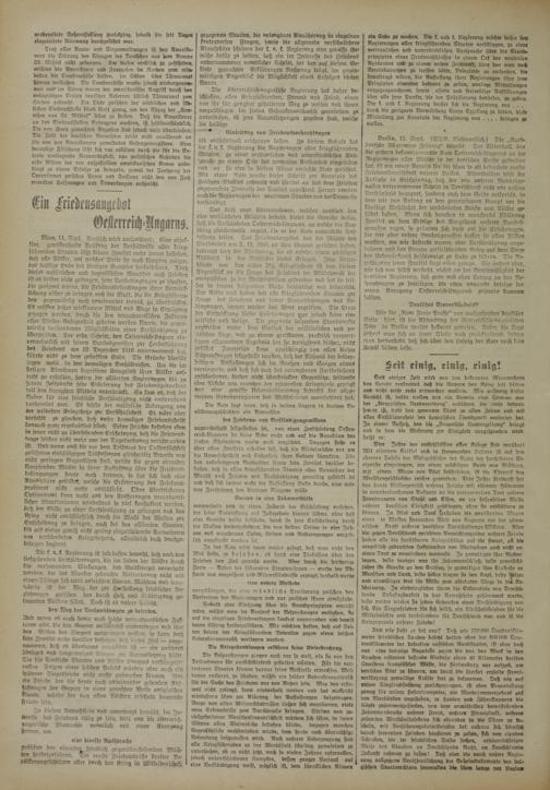 Die österreichisch-ungarische Negierung hat daher beschlossen, allen Kriegführenden, Freund und Feind, einen von ihr für gangbar gehaltenen Weg zu weisen und ihnen vorzuschlagen im freien Gedankenaustausch gemeinsam zu untersuchen, ob jene Voraussetzungen gegeben sind, welche die baldige