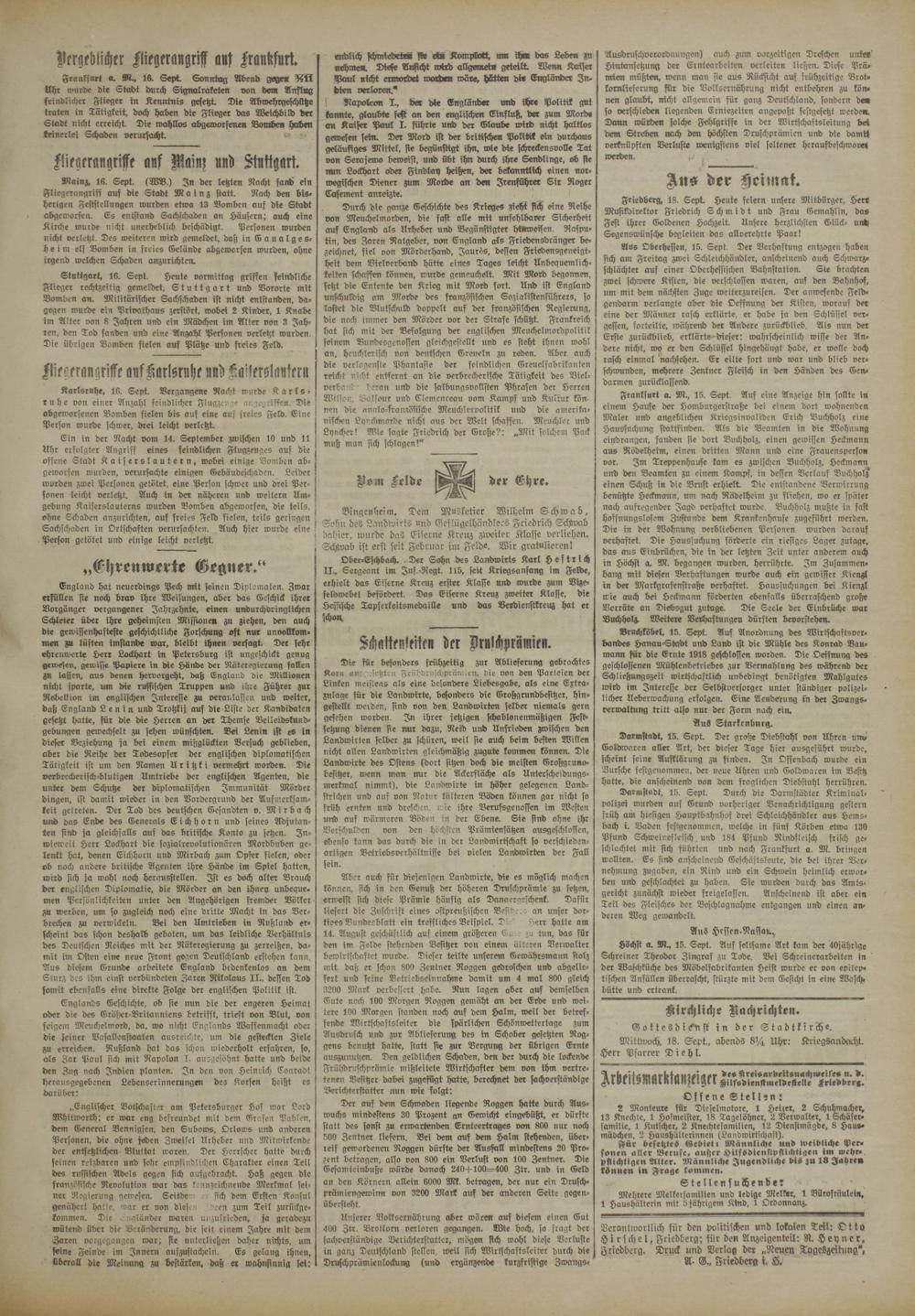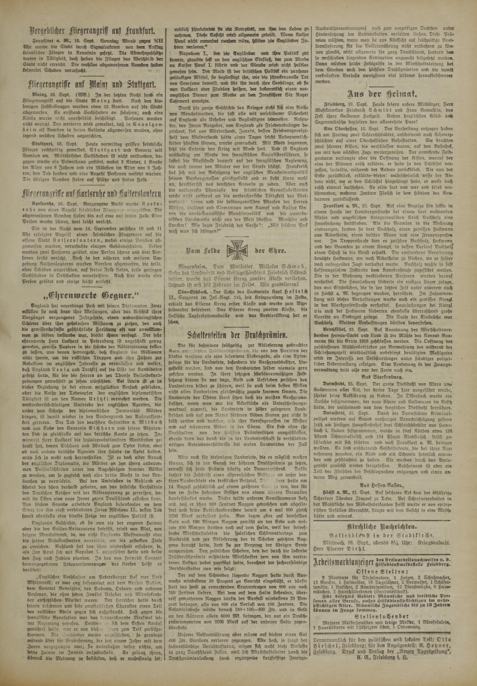 Karlsruhe, 16. Sept. Vergangene Nacht wurde Karlsruhe von einer Anzahl feindlicher Flugzeuge angegriffen. Die abgeworfenen Bomben fielen bis auf eine auf freies Feld. Eine Person wurde schwer, drei leicht verletzt.