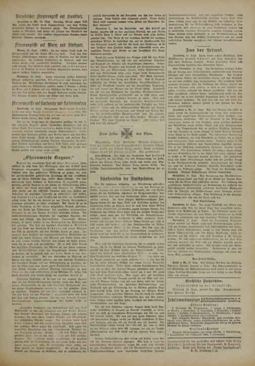 Frankfurt a. M.. 16. Sept. Sonntag Abend gegen MI llhr wurde die Stadt durch Signalraketen von dem Anflug feindlicher Flieger in Kenntnis gesetzt. Die Abwehrgeschütze traten in Tätigkeit, doch haben die Flieger das Weichbild der Stadt nicht erreicht. Die wahllos abgeworfenen Bomben haben keinerlei Schaden verursacht.