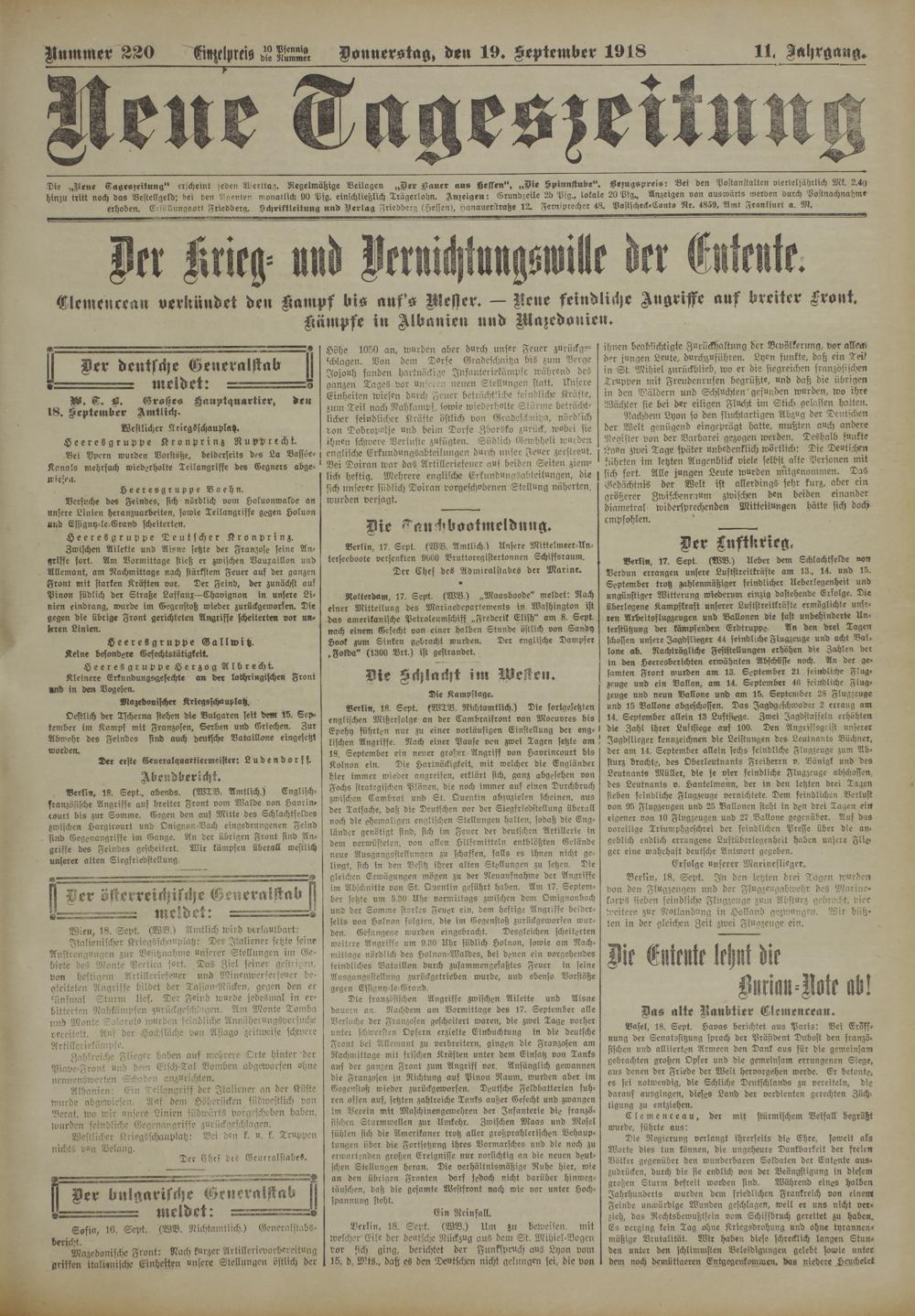 Berlin, 18. Sept., abends. (WTV. Amtlich.) Englisch- französische Angriffe auf breiter Front vom Walde von Havrin- court bis zur Somme. Gegen den auf Mitte des Schlachffeldes zwischen Hargicourt und Onignon-Bach eingedrungenen Feind sind Gegenangriffe im Gange. An der übrigen Front sind Angriffe des Feindes gescheitert. Wir kämpfen überall westlich unserer alten Siegfriedstellung.