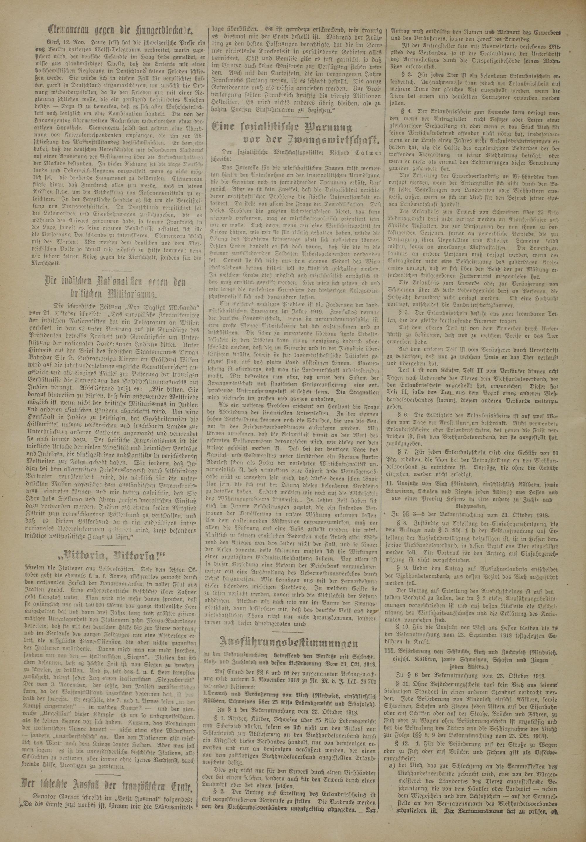 Genf. 12. Rov. $)cufe früh hat bic schweizerische Presse ein ovtz Berlin datiertes Wolfs-Telegramm verbreitet, worin zuge- fichcrt wird, der deutsche Gesandte im Haag habe gemeldet, er wisse aus glaubwürdiger Quelle, daß die Entente mit einer bolschewistischen Negierung in Deutschland* keinen Frieden schlie. ßen werde. Cie würde sich in diesem Fall für verpflichtet halten. zuerst in Deutschland einzumarschi-ren. um zunächst die Ordnung w'cderberzuitellen. da sie den Frieden nur mit einer Ne. gierung schließen wolle, die ein genügend begründetes Ansehen besitze. — Dazu ist zu bemerken, daß es sich aller Wahrscheinlichkeit nach lediglich um eine Kombination handelt. Die von der Havasagentur übermfttelicn Nachrichten widerfvrechen einer derartigen Hypothese. Clemenceau selbst hat gestern eine Abord. nung von Kriegskorrespondenten empfangen, die ihn zur Abschließung des Waffenstillstandes beglückwünschten. Er bem.rkie dab^-i, daß die deutschen Unterhändler mit besonderem Nachdruck auf einer A-nderunq der Bestimmung über die Aiifrechterhalt"ar der Blockade bestanden, In dieser Richtung si.'i die Lage Deutschlands und Oesterreich-Ungarns verzweifelt, wenn es nicht möglich sei. die drohende Hungersnot zu bekämpfen. Clemenceau fügte hinzu, daß Frankreich alles tun werde, was in seinen Krailen stehe, um die Beschaffung von Nahrungsmitteln zu erleichtern. In der Hauptsache handele es sich um die Bereitstellung vcn Transportmitteln. Da Deutschland verpflichtet sei dre Lokomotiven und Ei.enbahnwogen zurückzugeben. die es wählend des Krieges genommen habe, so komme Frankreich in die Lage, soweit es feine eig'ven Bedürfnisie gestattet, sich für di? Bersoroung Deu schlands zu interessieren. Clemenceau schloß * mH den Werten: Wir werden dem deutschen und dem öfter,