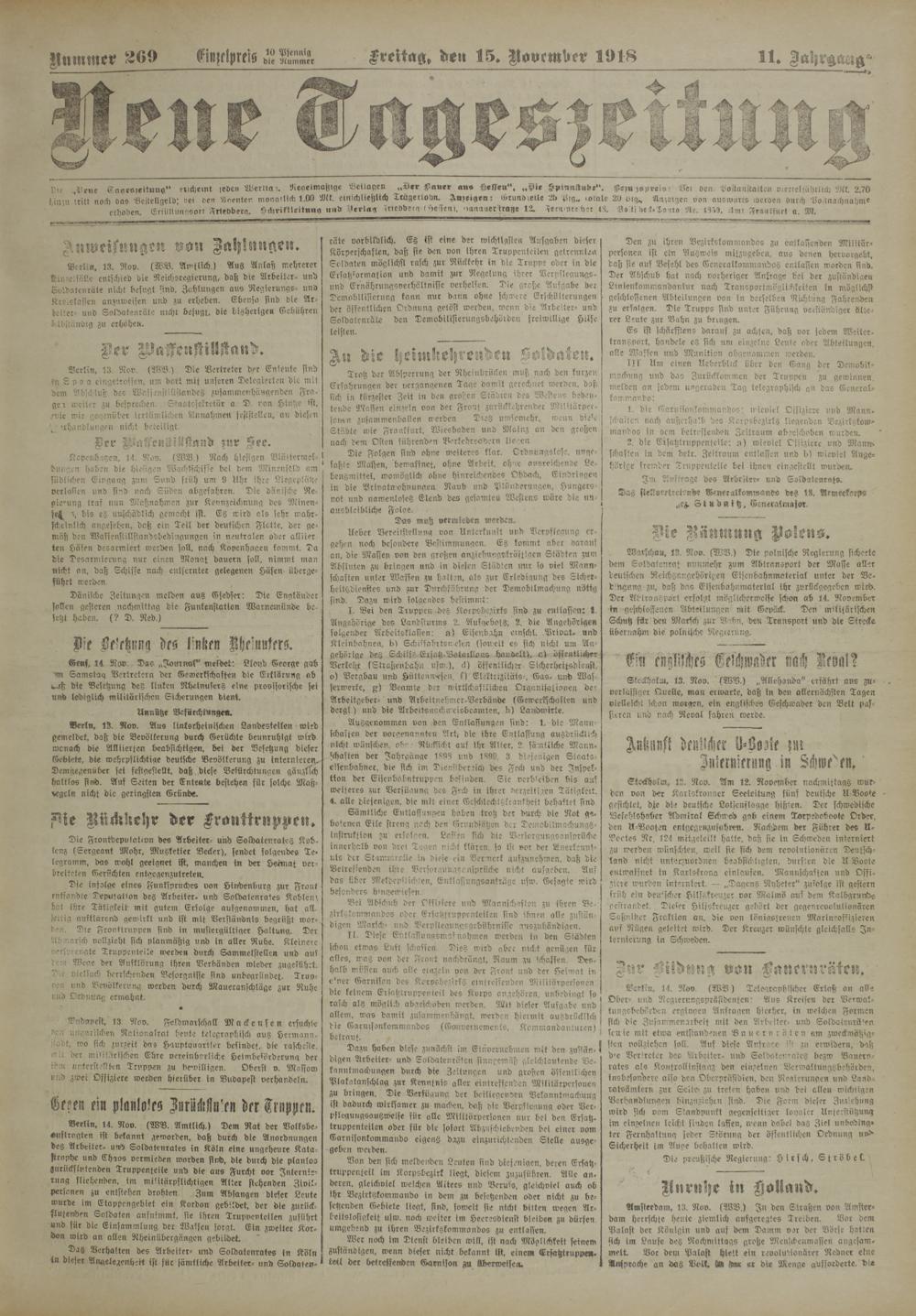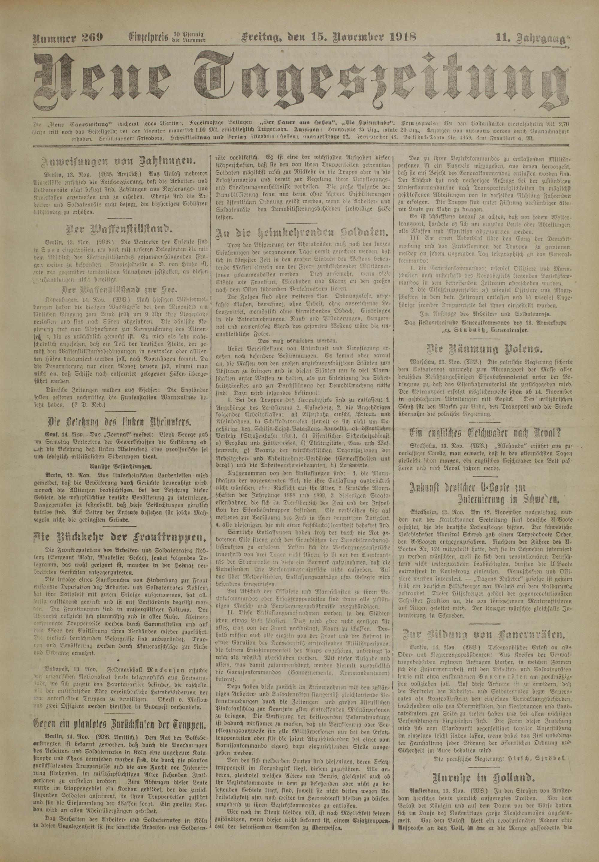Die infolge eines Funffpruches von Hindenburg zur Front entsandte Deputation des Arbeiter, und Soldatenrates Koblenz hat ihre Tätigkeit mit gutem Erfolge ausgenommen, hat allseitig auftlärenid gewirkt und ist mit Verständnis begrüßt wor- r e. Die Fronttruppen sind in mustergültiger Haltung. Der Abmarsch vollzieht sich planmäßig und in aller Ruhe. Kleinere versprengte Truppenteile werden durch Sammelstellen und aus Wege der Aufklärung ihren Verbänden wieder zugeführt. Die vielfach herrschenden Besorgnisse sind unbegründet. Truv- oen und Bevölkerung werden durch Maueranschläge zur Ruhe und Ordnung ermahnt.