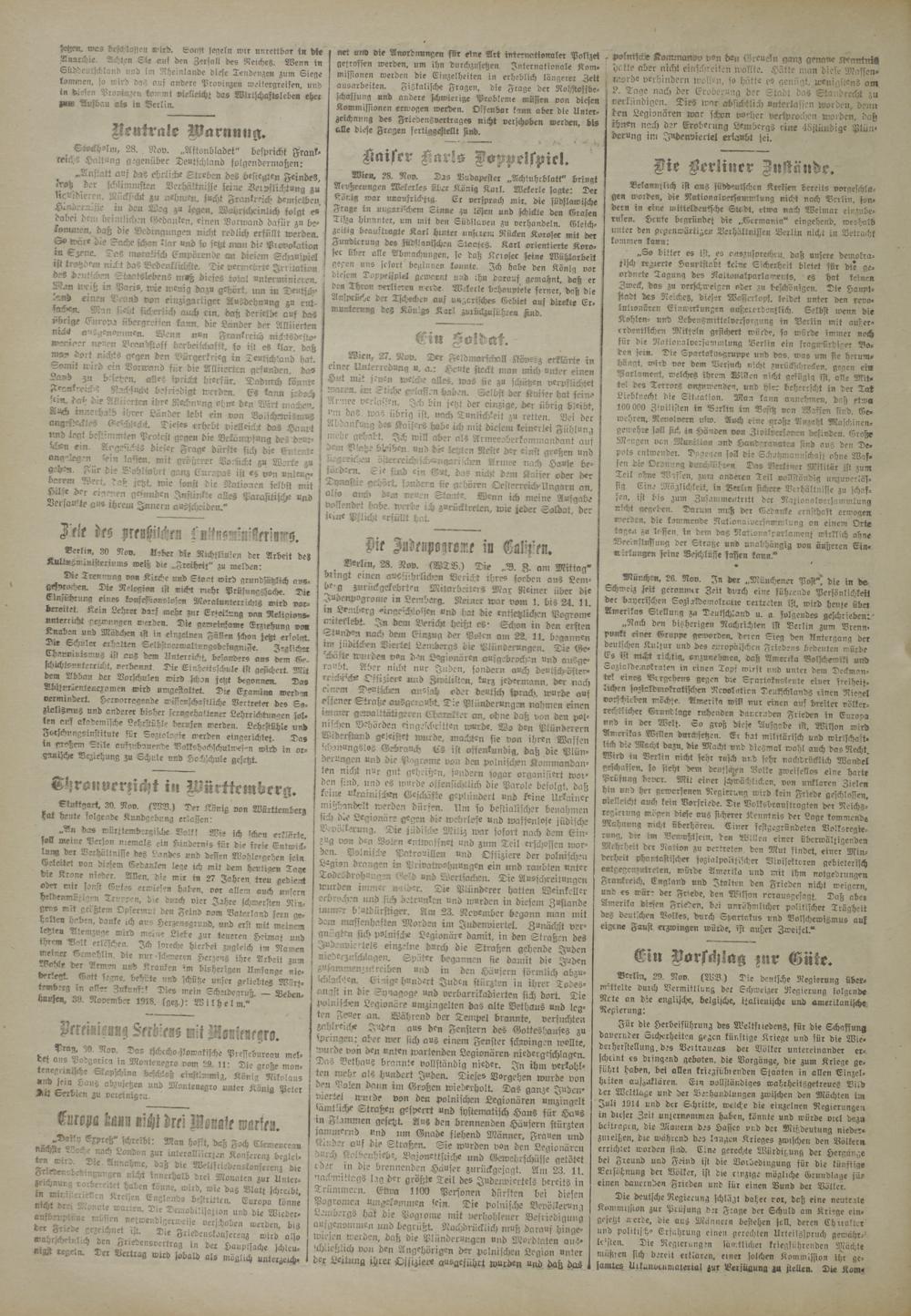»An das württemdergisck^ Volk? Wie ich schon erklärte ssll meine Person niemals ein Hindernis für die freie Entwick- ur»8 der Verhältnisse des Landes und dessen Wohlergehen sein Gelertet von diesem Gedanken lege ich mit dem heutigen Tage me Krone nieder. Allen, die mir in 27 Jahren treu gedient oder mir sonst Gutes erwiesen haben, vor allem auch unfern heldenmütigen Truppen, d-e durch vier Jahre schwersten Ringens Mll größtem Opfermut den Feind vom Vaterland fern ae-