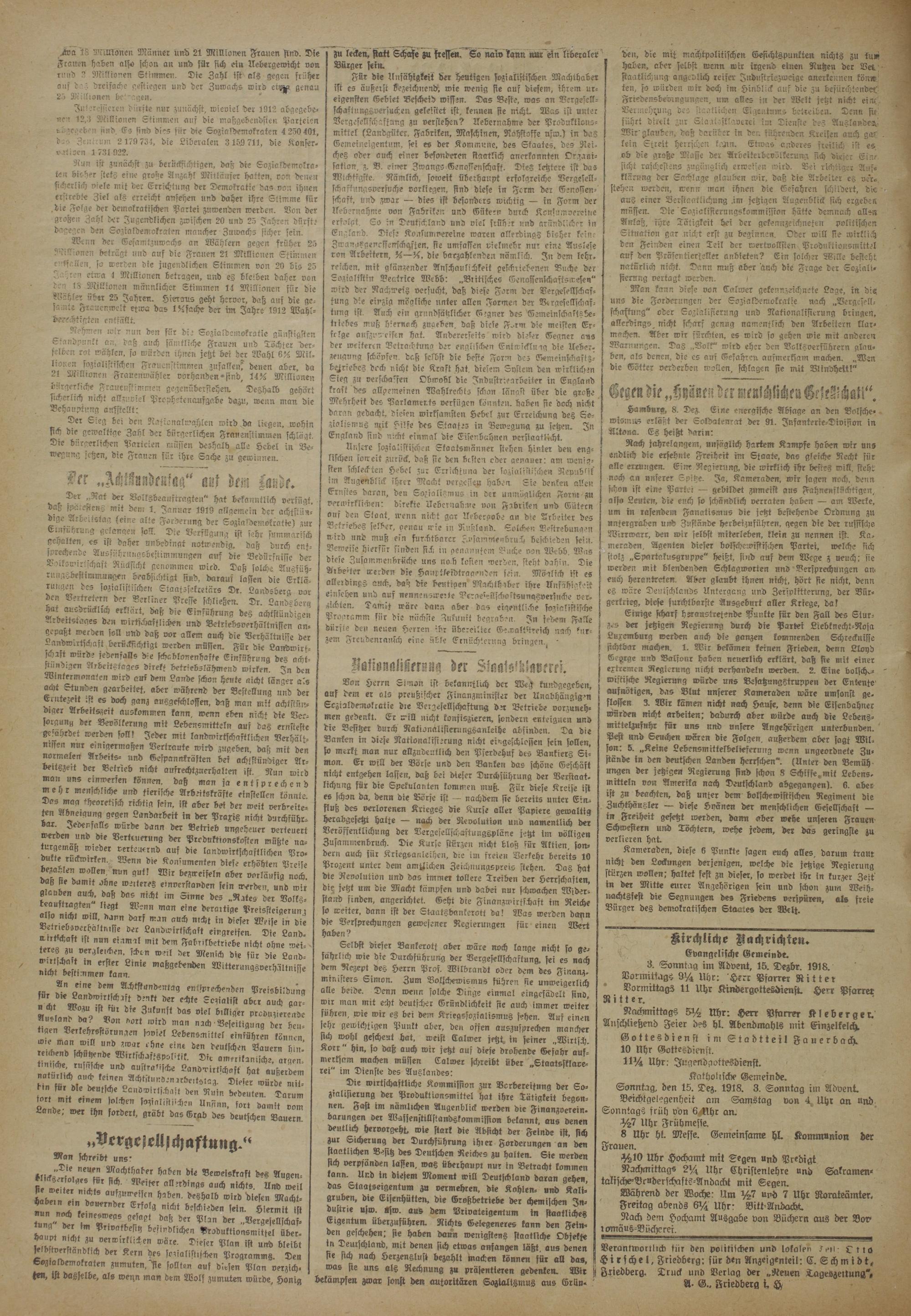 r :;^ at Volksbeauftragten" hat bekanntlich verfugt, daß spätestens mit dem 1 . Januar 1919 allgemein der achtstündige -^rb'.'ctsiag feine alte Forderung der Sozialdemokratie) zur Emführung gelangen soll. Die Verfügung ist sehr summarisch gehalten, es ist daher unbedingt notwendig, daß durch entsprechende^ Aussührunasbestimmungen auf die Bedürfnisse der Volkswirtschaft Rücksicht genommen wird. Daß solche Ausfüh- rnugsbestimmAHgen beabsichtigt sind, darauf lasten die Erklär ruklgen des sozialistischen Staatssekretärs Dr. Landsberg vor den Vertretern der Berliner Presse schließen. Dr. Landsbera ausdrücklich erklärt, daß die Einführung des achtstündigen -.r^eftstages den wirtschaftlichen und Betriebsverhältnisten an- tzcpaßt werden soll und daß vor allem auch die Verhältnisse der Landwirtschaft berikcksichtigt werden muffen. Für die Lartdwirt- schrft würde jedenfalls die schablonenhafte Einführung des achtstündigen Arbeitstages direkt betriebslähmend wirken. In den Wintermonaten wird auf dem Lande schon heute nicht länger als acht Stunden gearbeitet, aber während der Bestellung und der Erntezeit ist es doch ganz ausgeschlossen, daß man mit achtstündiger Arbeitszeit auskommen kann, wenn eben nicht die Versorgung der Bevölkerung mit Lebensmitteln auf das ernsteste Sesahrdet werden soll! Jeder mit landwirtschaftlichen Verhältnissen nur einigermaßen Vertraute wird zugeben, daß mit den normalen Arbeits- und Gespannkräften bei achtstündiger Ar- oeitszert der Betrieb nicht arrfrechtznerhaffen ist. Nun wird man uns einwerlen können, daß man ja entsprechend mehr menschliche und tierische Arbeitskräfte einstellen könnte Das mag theoretisch richtig sein, ist aber bei der weit verbreiteten Abneigung gegen Landarbeit in der Praxis nicht durchführbar Zeoenfalls würde dann der Betrieb ungeheuer verteuert werden und d,e Verteuerung der Produktionskosten müßte na- turgemaß wieder verteuernd auf die landwirtschaftlichen Produkte ruckwrrken. Wenn die Konsumenten diese erhöhten Preise bezaplen wollen, nun gut! Wir bezweifeln aber vorläufig noch, daß sie damit ohne werteres einverstanden sein werden und wft glauben auch, daß das nicht im Sinne des .Rates der Volkß-