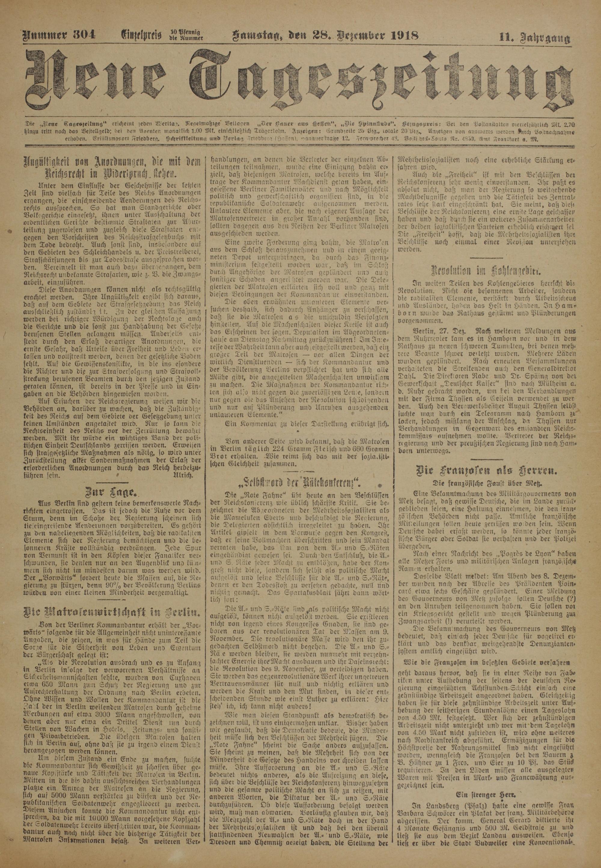 Umnmer 304 A^elpreis Xltx Samst ag, freu 2 8 . Dezember 1918 11 , Jahrgang