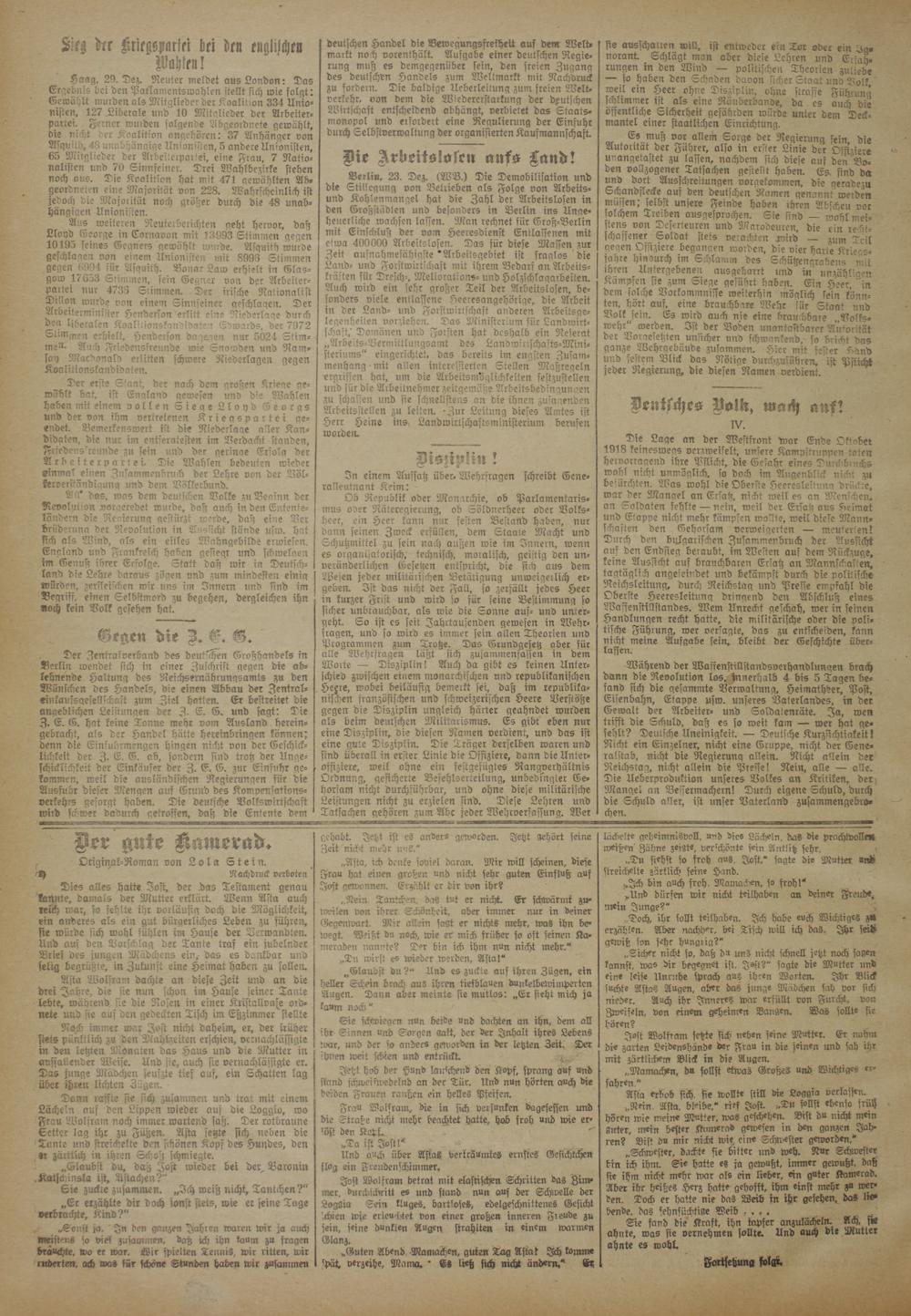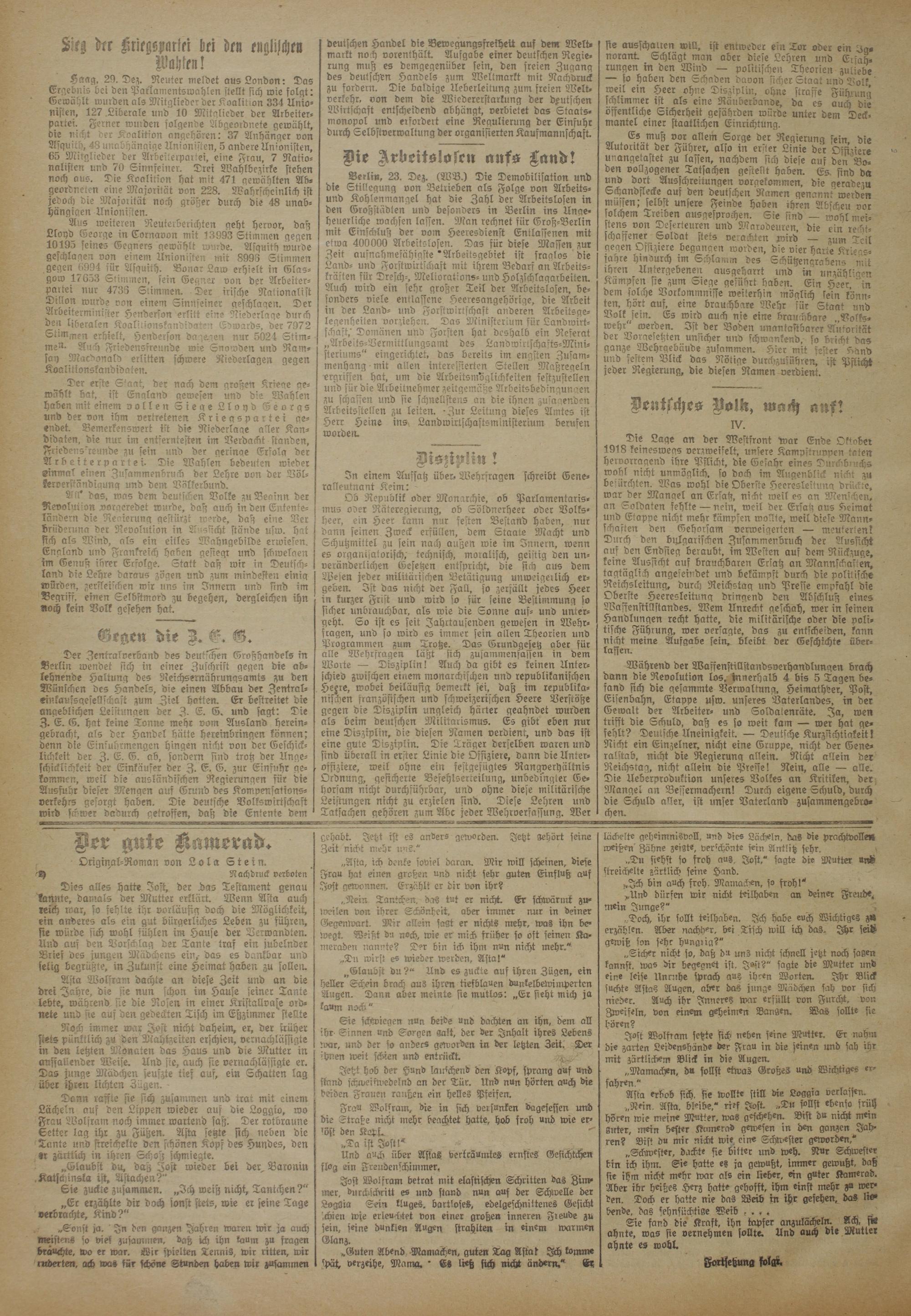 All* das, was dem deutschen Volke zuVemnn der Revolution worgeredet wurde, daß auch in den Ententelandern die Reoierung gestürzt werde, daß eine Ver brüderuna der Revolution in Aussicht stände usw. hat sich als Wind, als ein eitles Wahngebilde erwiesen. England und Frankreich haben gesiegr und schwelaen im Genuß ihrer Erfolge. Statt daß wir in Deutschland die Lehre daraus zögen und zum mindesten einig würden, zerfleischen wir uns im Innern und sind im Begriff, einen Selbstmord zu begehen, dergleichen ihn «och kein Volk gesehen hat.