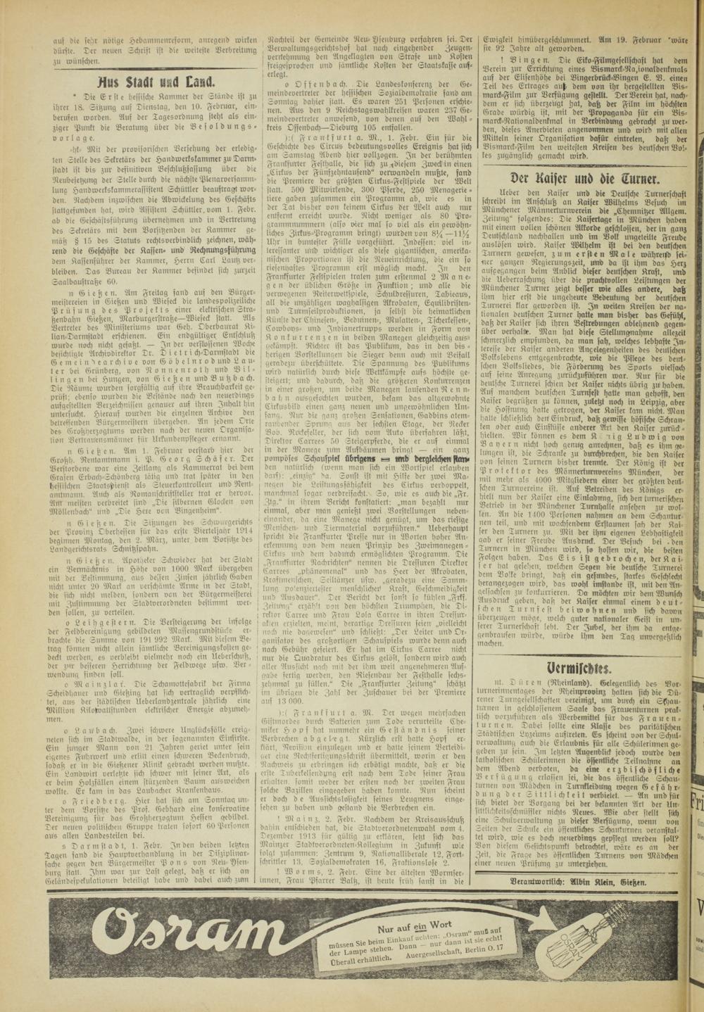 n G i e tz e n. Die Sitzungen des «chwucgerichts der Provinz Oberhessen für das erste Vierteljahr 1914 beginnen Montag, den 2. März, unter dem Vorsitze des Lcindgerichlsrats Schnitzspahn.