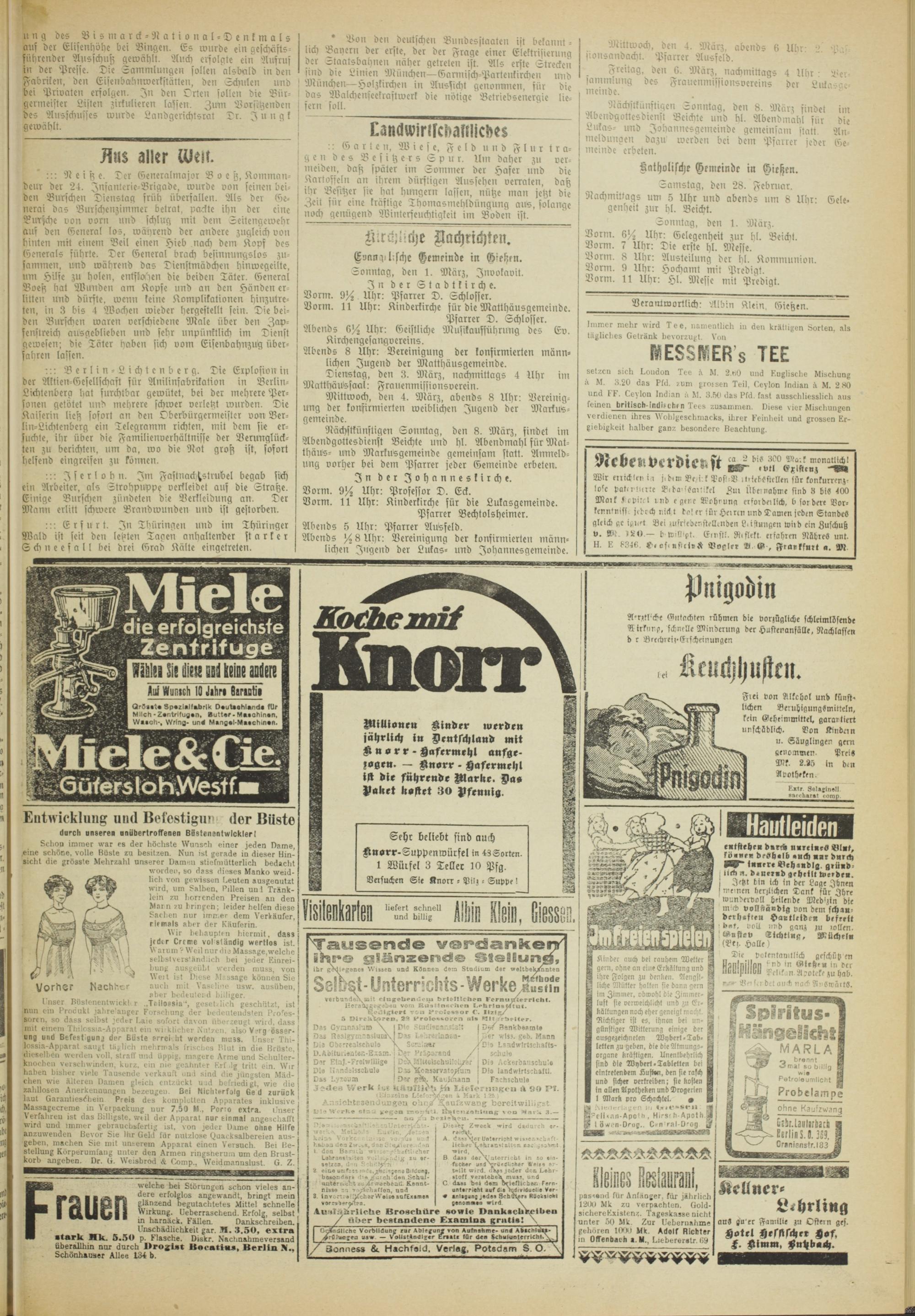 Dienstag, den 3. März, nachmittags 4 Uhr im Matthüutzsaal: Frauenmissionsverein.