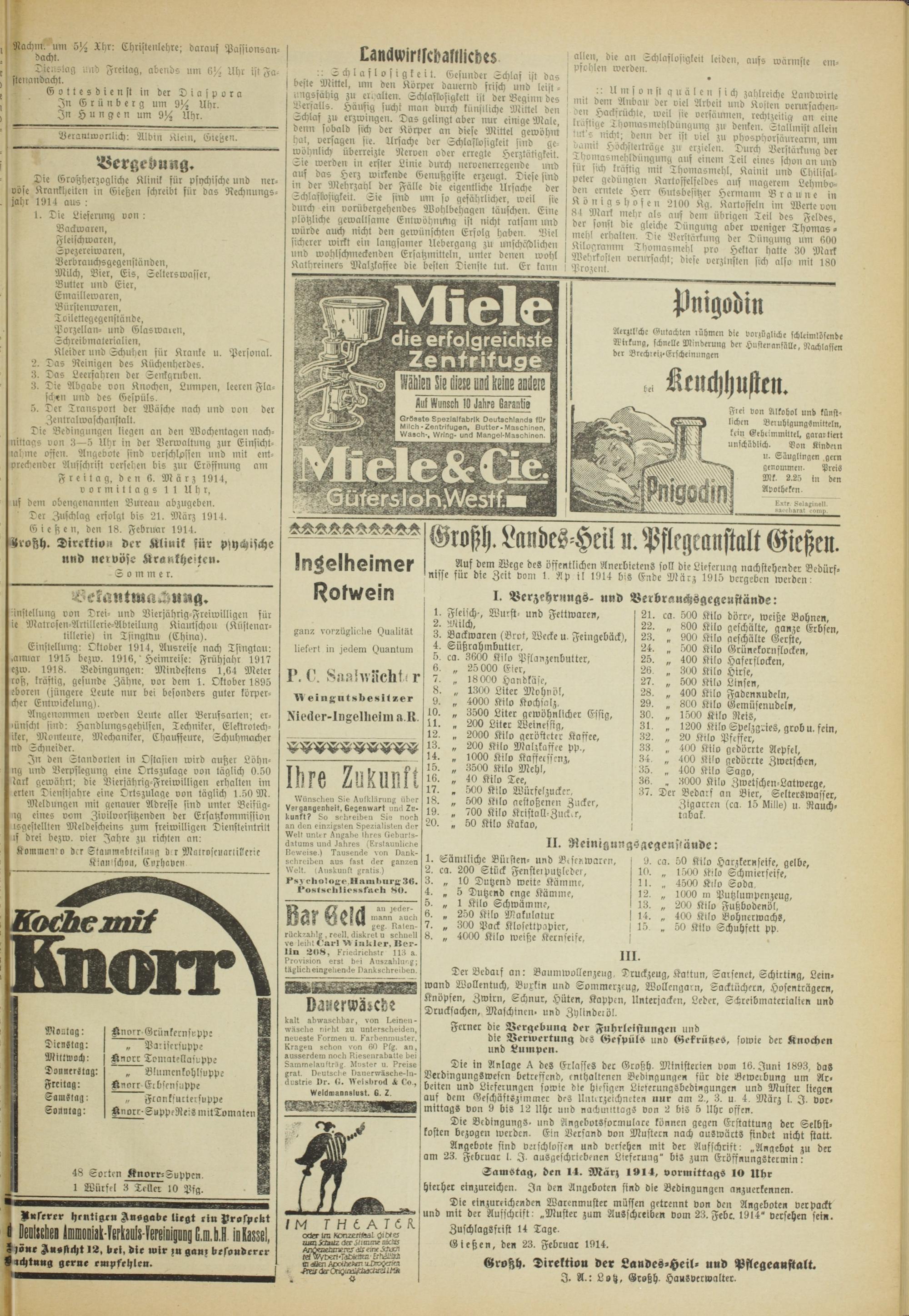 ' Der Zuschlag erfolgt bis 21. März 1914. Gießen, den 18. Februar 1914. tzrotzh. Direktion der Älnnk für psychische und nervöse jtrankheitcn. Sommer.