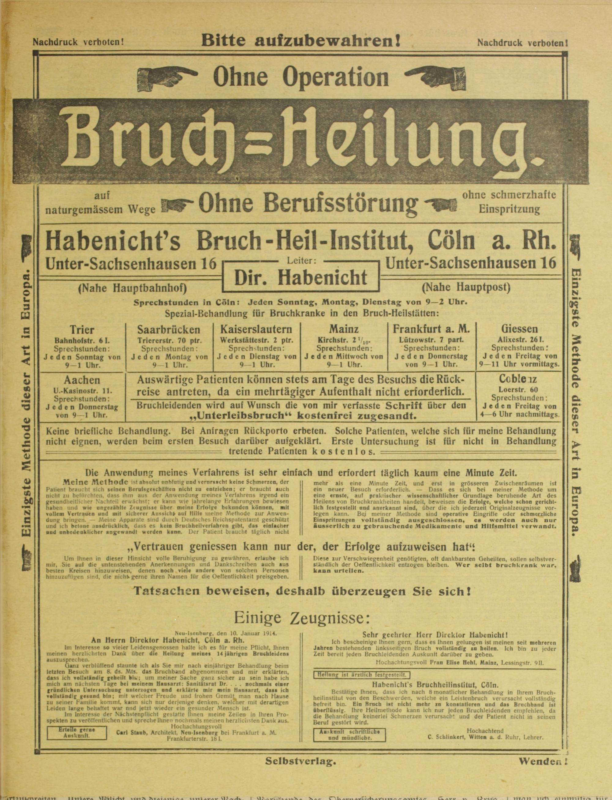 Diese zur Verschwiegenheit genötigten, oft dankbarsten Geheilten, sollen selbstverständlich der Oeffentlichkeit entzogen bleiben. Wer selbt bruchkrank war, kann urteilen.