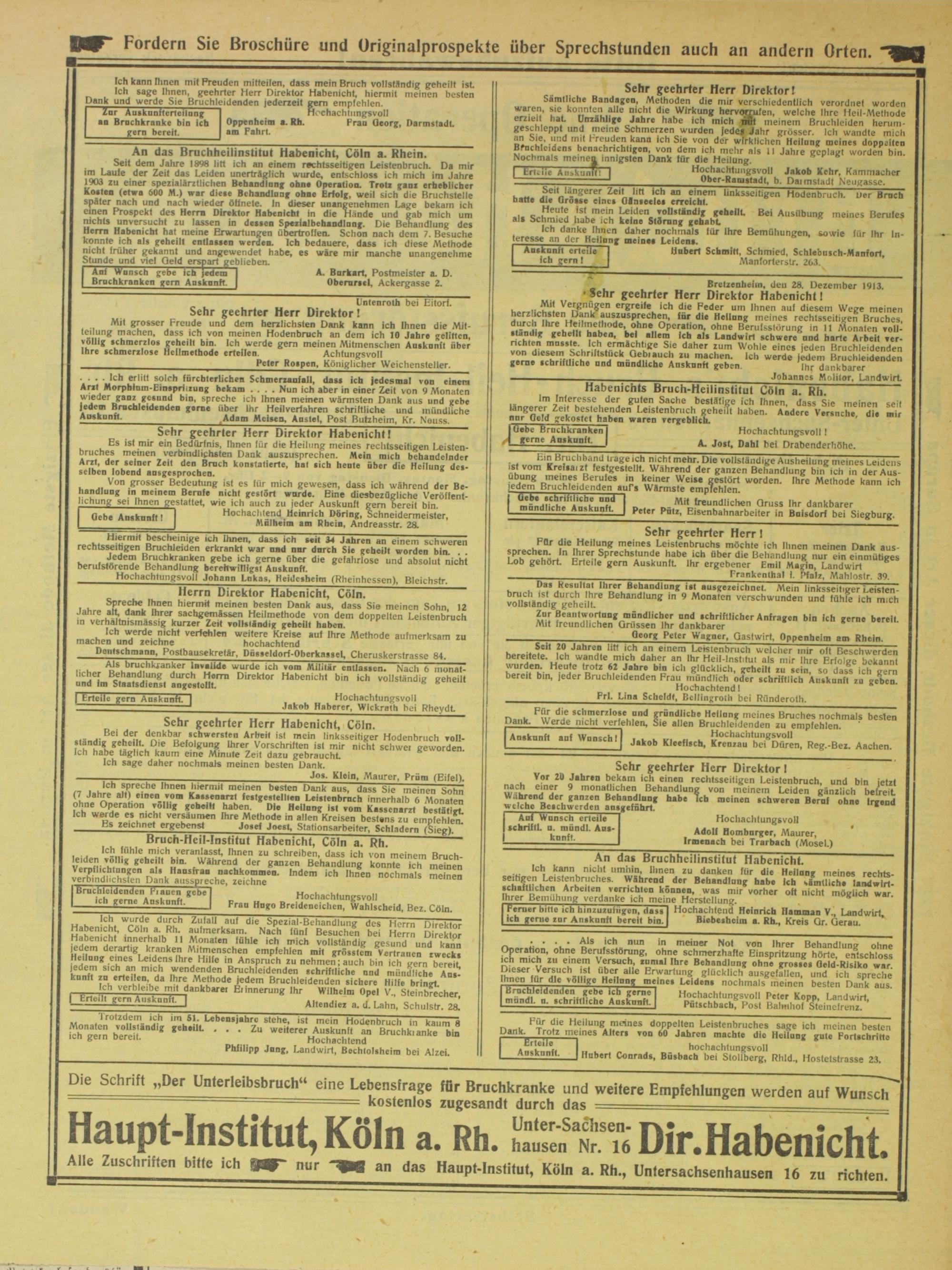Ich wurde durch Zufall auf die Spezial-Behandlung des Herrn Direktor Habenicht, Cöln a. Rh. aufmerksam. Nach fünf Besuchen bei Herrn Direktor Habenicht innerhalb 11 Monaten fühle ich mich vollständig gesund und kann jedem derartig kranken Mitmenschen empfehlen mit grösstem Vertrauen zwecks Heilung eines Leidens Ihre Hilfe in Anspruch zu nehmen; auch bin ich gern bereit jedem sich an mich wendenden Bruchleidenden schriftliche und mündliche Auskunft zu erteilen, da Ihre Methode jedem Bruchleidenden sichere Hilfe bringt.