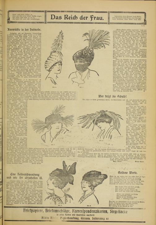 Bei Abb, ö sehen wir eine ganz einfache schwarze Samttogue, deren einziger Aufputz in . dem stilvolle», sclbsigearbeitcten Schmetterling besteht, Sür geschickte Sraucnhände muß cs ein wahres Vergnügen sein, diese hübsche ?e>int-Iacc-Arbeit auszusühre». Auch im Srühjahr und Sommer würde dieser moderne kutschmuck für Slrohhüte, sowie für leicht« Seidcnhüte zu empfehlen sein, - Also fort mit allen Auswüchsen einer ungesunden Mode- richtung, die jenseits der Vogesen auch nur ihr „besonderes" Publikum hat und von der vornehmen Pariserin ebensowohl gemieden wird, wie von der joliden deutschen Srau, kelene Grube.